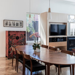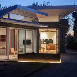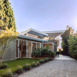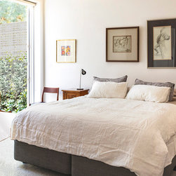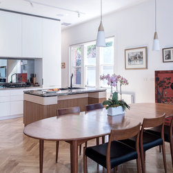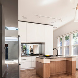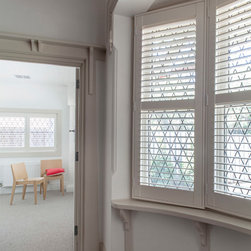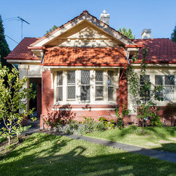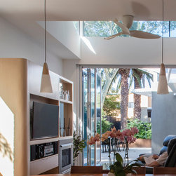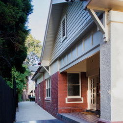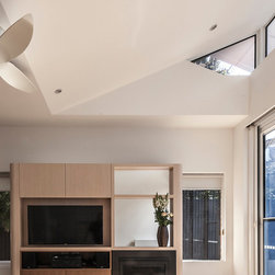 The most radical elements of Two Peaks house are the pop-up roof forms; raking-triangular-jutting-out “peaks”; designed to protect from summer sun, allow winter sun, dramatically improve daylight quality and thermal efficiency thourgh ceiling fans, hydronic heating and cross-ventilation. The thermal mass effect of the original plastered brick walls of the Edwardian house, and of the reverse brick-veneer-exposed-slab of the “writer’s” studio, is optimised. The white modern lines of a contemporary expression of pergola acts as sun shading for lower-tier windows, and the vertical white screen dividing the courtyard, though a parallax action - allows light but not views through.