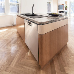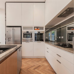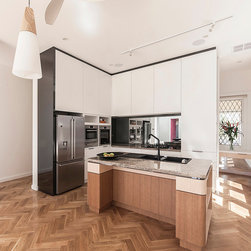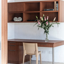 The design is remarkable for its beautiful sensitivities and rigorous detailing. The writer’s studio explores rich hues of timber-veneer referencing Australian classical modernism, and complementing textures of painted brick, concrete slab, undyed wool carpet and high level windows. In the house, the oak parquetry together with unique ensuite tiles creates a richly textured floor, offset by the kitchen of white cabinets doors, mirror black rimex end panels and mirror splashback. Three unique rounded-corner joinery pieces create modern heirlooms.