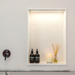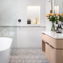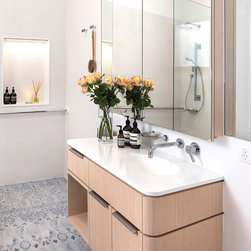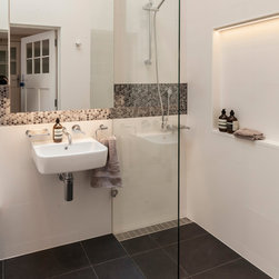 Clever thinking extends down to the scales of cost and detail. The retired clients had fundamental brief elements of restricted budget, small environmental footprint, accommodating family as well as future live-in carers, health challenges including poor eyesight and mobility– and wanted to retain a lyrical connection with garden and palm trees. These brief requirements were accommodated through the use of orientation, wide doorways, flush thresholds, discreet handrails in shower recesses and as shower rails, and a raised rear terrace to provide step-free accessibility. By reducing the footprint of the main house - reusing leadlight windows, light fittings and ALL old bricks for use in the reverse brick veneer studio –together with efficient landscaping strategies, the whole site was renovated within budget.