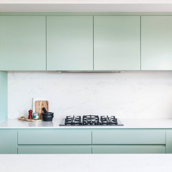 Our design team listened to our clients and created an open space kitchen area with a U- shape layout and plenty of storage behind their bright sage green touch to close cabinets.