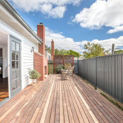 The remodel included opening up the kitchen, dining, and living areas, creating a spacious and open-plan flow throughout the house. The central hallway was blocked to make way for a large, stylish bathroom with modern fixtures and finishes, juxtaposed by a classic claw foot bathtub. The dining room features a unique wine closet, using original reclaimed timber for the shelving that adds a touch of character to the room.