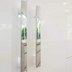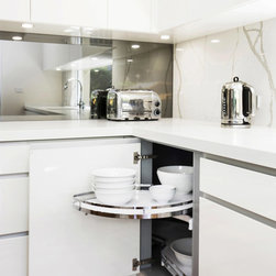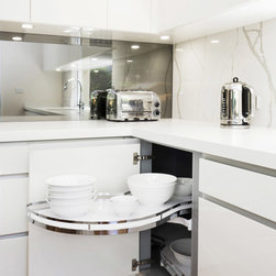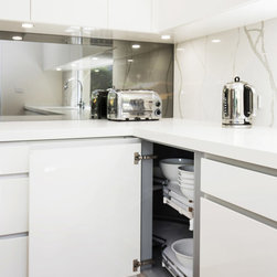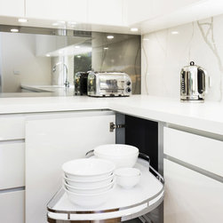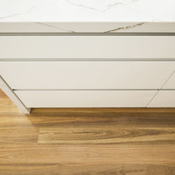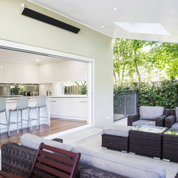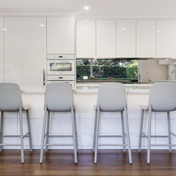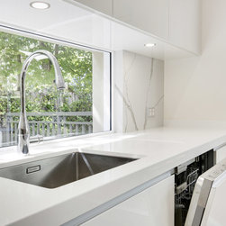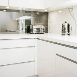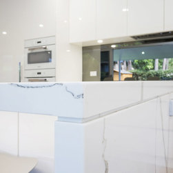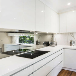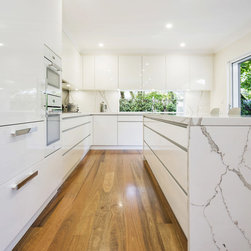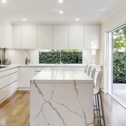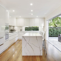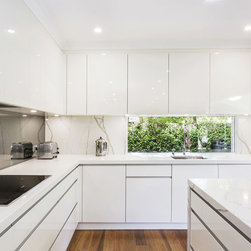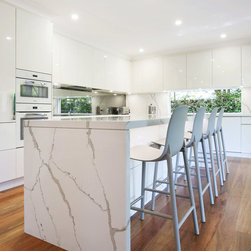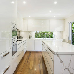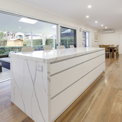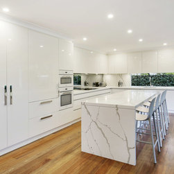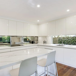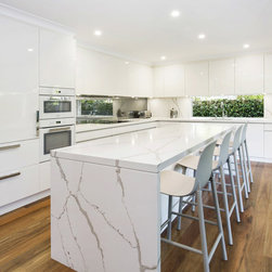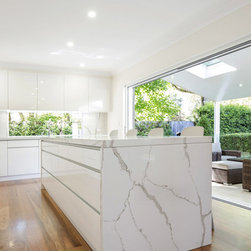 Kitchen renovation for a family home in the suburb of Wahroonga. The kitchen space has been enlarged by removing a wall and pushing into an adjoining room. Large sliding doors now connect the kitchen/dining room to an outdoor entertaining space. The kitchen is minimalist in appearance but remains very practical through the use of integrated handles, slimline handles and a well designed layout. A smoked mirror splashback subtly draws in the exterior view while a Calacatta Blanco clad island adds a touch of sophistication.