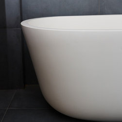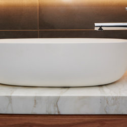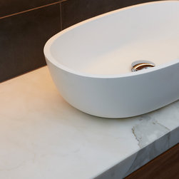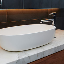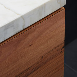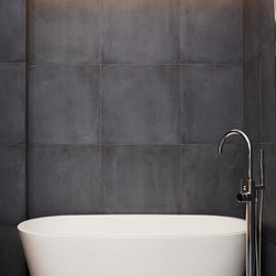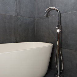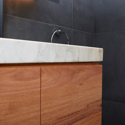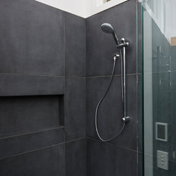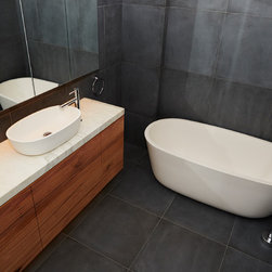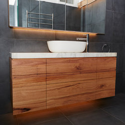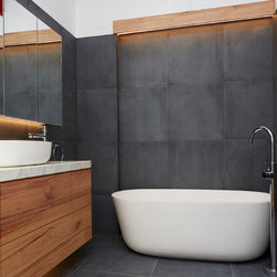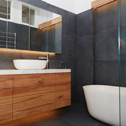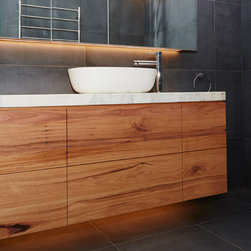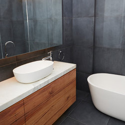 A bathroom that makes a bold statement with all the modern comforts created by Bathtime Bathrooms. The perfect bathroom for a warehouse conversion. Rectified Italian 600mm x 600mm Indigo tiles splash across the floor and up the walls to form the backdrop to this warehouse-style bathroom. The custom-made vanity unit features warm chestnut timber with a Carrara marble benchtop. A recess in the shower wall makes a great storage space for bottles of lotions and potions, and a glass screen divides the areas of the room without interrupting the overall spacious appearance. Tapware and fixtures in bright metal are perfect for the overall style. A luxurious bath, floor heating and LED lighting add creature comforts that make this room a pleasure to use.