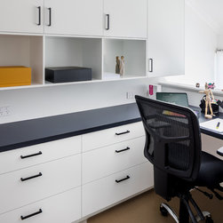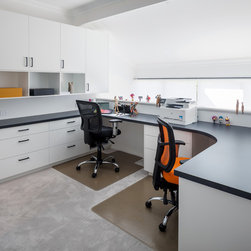 Study/office desk benchtop is Laminex Charcoal and handles Castella Manhattan.