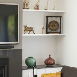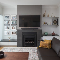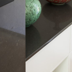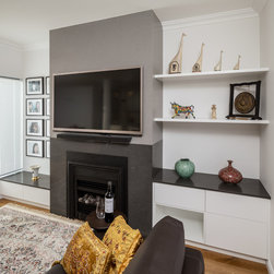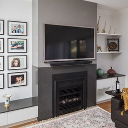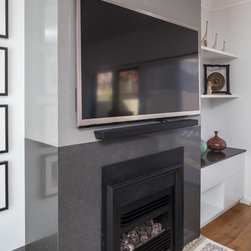 TV/Fireplace stone cladding is Caesarstone Raven and Oyster.