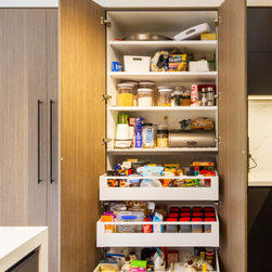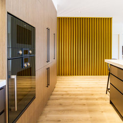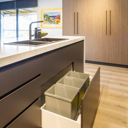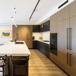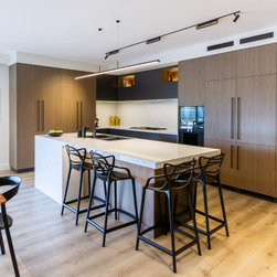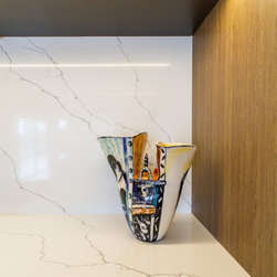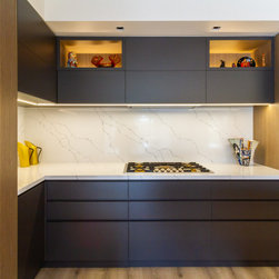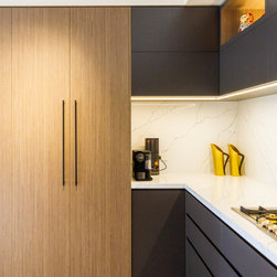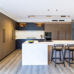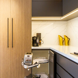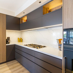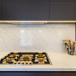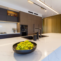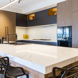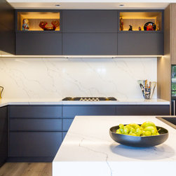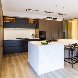 Stunning kitchen renovation featuring dark cabinets and white engineered stone. It's moody and inviting with a touch of mid-century glamour.