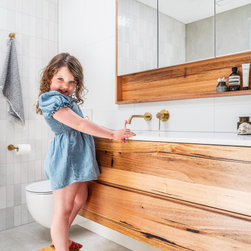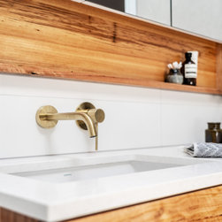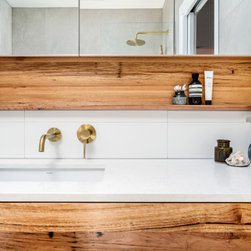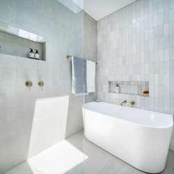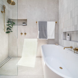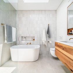 Ample light with custom skylight. Hand made timber vanity and recessed shaving cabinet with gold tapware and accessories. Bath and shower niche with mosaic tiles vertical stack brick bond gloss