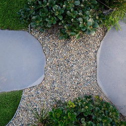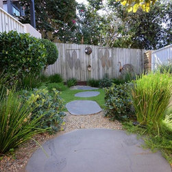 Oversized step stones make access easy, and maintenance is a thing of the past with a deep layer of gravel. Our clients has even provided a native bee hotel for our local friends to take advantage of the flowering Grevillea and Myoporum groundcovers.