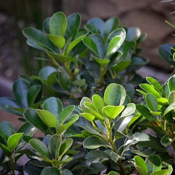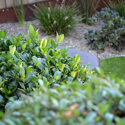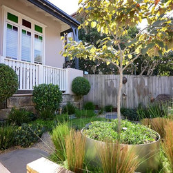 The oversized raised planter creates strong visual interest, whilst supporting a stunning feature Deciduous Cercis and underplanting of scented gardenia radicans. The oval long pile synthetic grass is soft under foot for our four-legged family, whilst allowing great drainage. Its shape provides for deep garden beds, allowing for a variety of hardy native plants and grasses, just right for a ramble and rummage. Clipped Westringia, Gardenia and Raphiolepis bring a formal feel and year-round flower, whilst Lomandra creates the contrast.