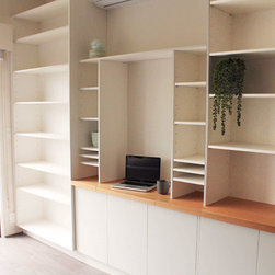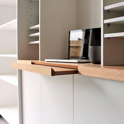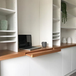Custom designed and built shelving unit with built in keyboard slider. Colour Board "Frosty White" for the shelving and timber veneer top in "Plantation Oak".