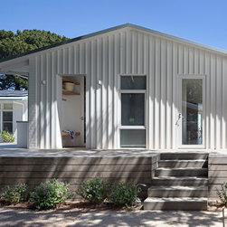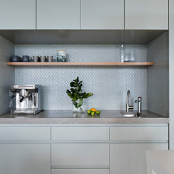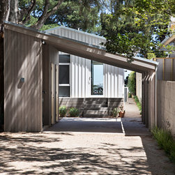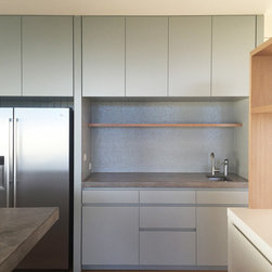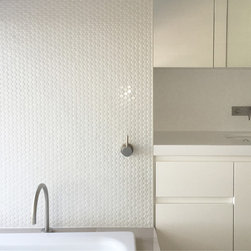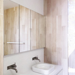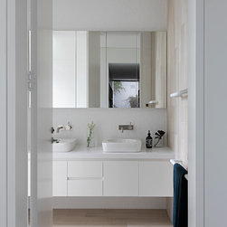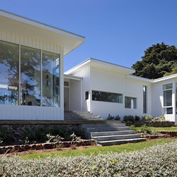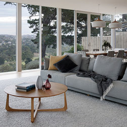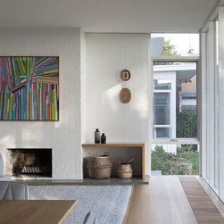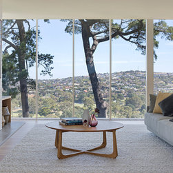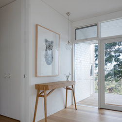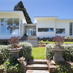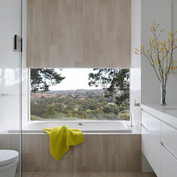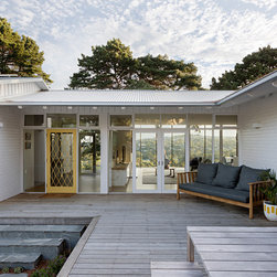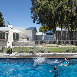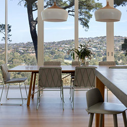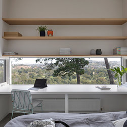 This renovation to a mid century house at the top of a valley in Newtown is all about the sweeping views of the surrounds, and the balance between the old and the new. The Owners had an emotional connection to the existing house as it had been in the family a long time, so they were keen to retain its spirit, whilst opening up the poky spaces to improve flow and amenity. The double sided glass entry and original fireplace were retained, and the new spaces extended around them. The South side of the house was opened up for the views to be appreciated from all the rooms, including the bathrooms. The spaces were enlarged to remove the previous awkwardness and maximise the use and enjoyment of the areas. Decks and a pool were added to the large north front garden to maximise the experience of the full site.