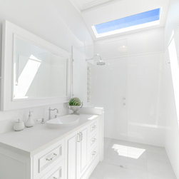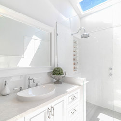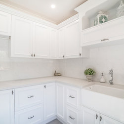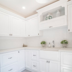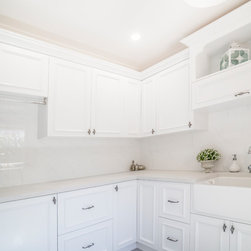 For the first 3 rooms - Caesarstone Cloudburst Concrete benchtops. Shaker Bolection Mould doors in satin lacquer in Polar White. Castella handles.