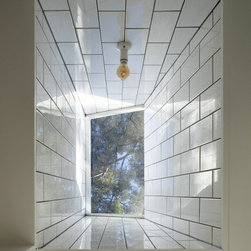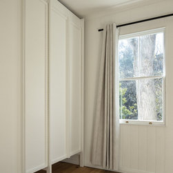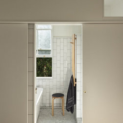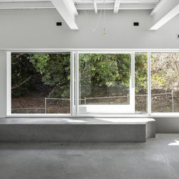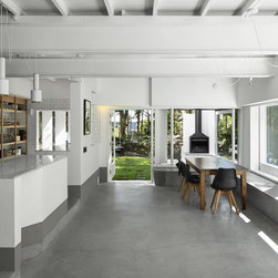 A deep services corridor of kitchen, pantry and laundry is dug in to the slope while the edge of the living space sit above ground level and offer a view in to the opposing hillside. Operable glazing wraps the living space and the occupant can maintain an immediate connection with this landscape with concrete bench seats allowing for an occupied edge. A deep weatherboard skirt controls solar gain and protects this interior from the often harsh Queensland weather.