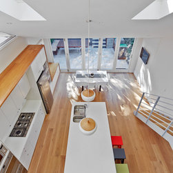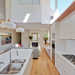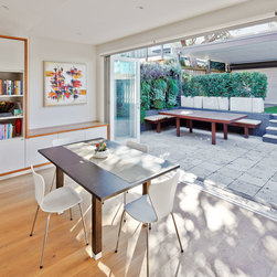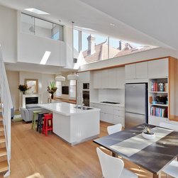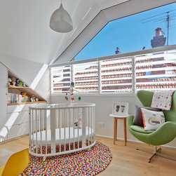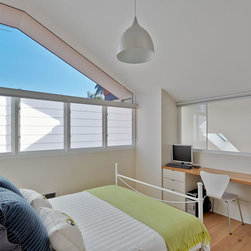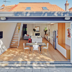 This project has transformed a two bedroom semi-detached dwelling into a 3 bedroom 2 bathroom home with an innovative and light-filled extension to the rear and into the existing roof space. The original room at the front with bay window has been kept as master bedroom and the second bedroom has been converted to a bathroom, laundry and walk-in robe. Upstairs the roof was carefully manipulated to provide maximum ceiling height, light and ventilation, housing two new double bedrooms and a 2nd bathroom. The open plan living at ground floor takes advantage of the additional volume with high level glazing, a 4 metre high ceiling over the kitchen, tapering to single-storey where it meets the rear-courtyard.