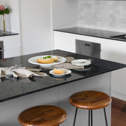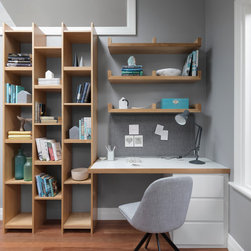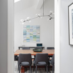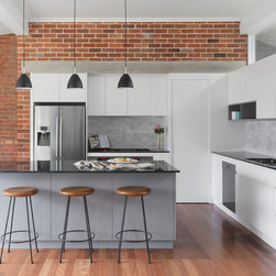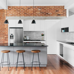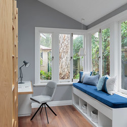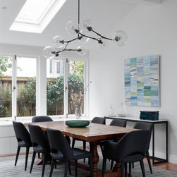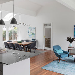A cavernous living area that once housed a 20+ year old kitchen, dining room and central brick fireplace was opened up into a multi-functional space for a busy family of six. The new space accommodates a large transitional kitchen that incorporates the original house brick wall so loved by the owners, a living area and separate dining space as well as a light-filled home office that overlooks the garden.