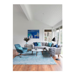 A palette of calming blues highlights the refinished walnut timber floors, while the soaring vaulted ceilings are punctuated by a striking large-scale chandelier in the dining area and the repetition of black pendants above the kitchen island bench. This is a cohesive transitional space that successfully blurs the line between traditional and contemporary and invites the owners to linger and enjoy.