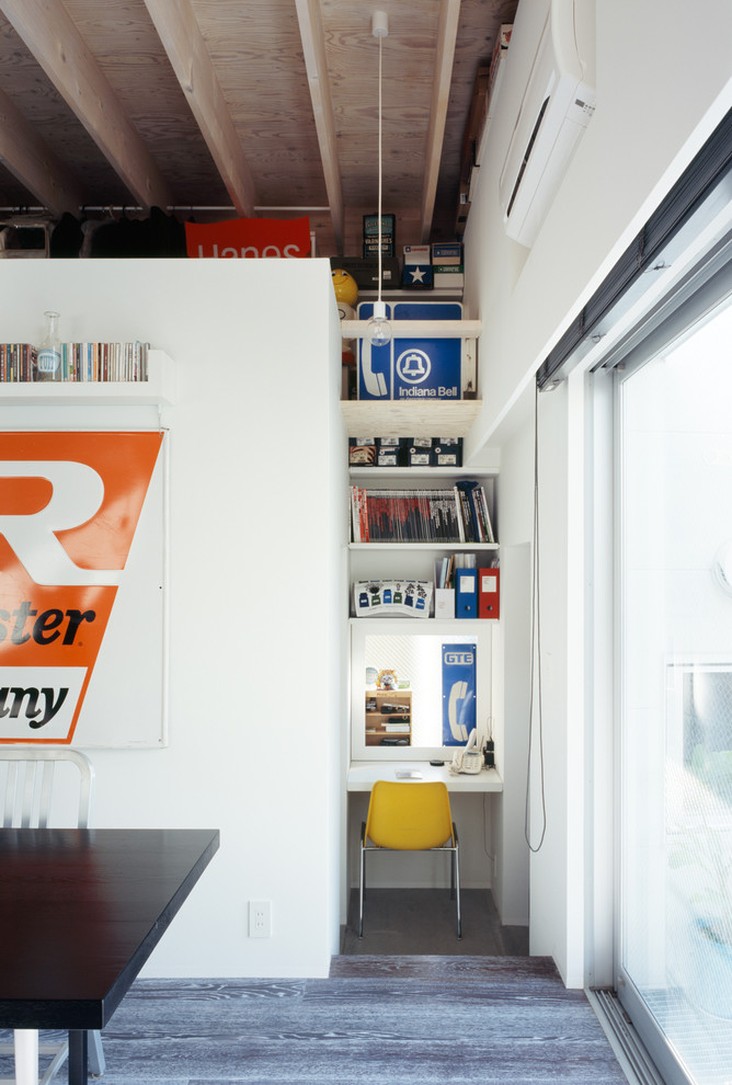 | 意外な穴場の廊下にミニ書斎を 廊下が単なる通り道になるか、有効に活用できるかは工夫次第という例。壁に沿って圧迫感のない背の低い棚を設置して本棚に。その一部分は天板のみを残してデスクにすれば、書斎の完成。 |