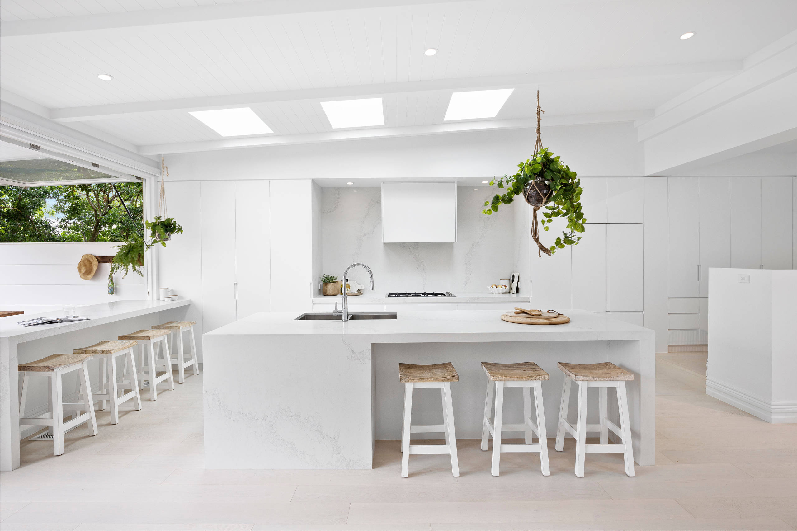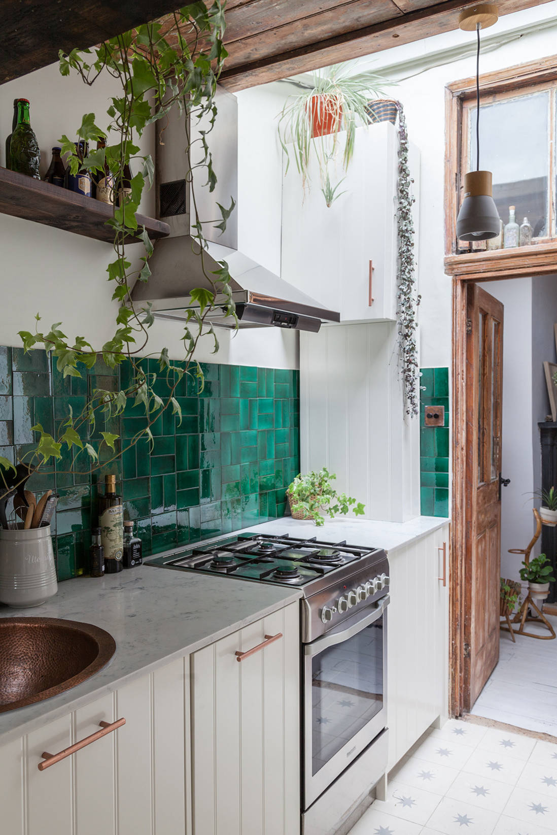 If you have exposed wooden ceiling joists, as in this airy kitchen, you have a ready-made spot from which to hang a simple planter for trailing foliage. This can also be a good way to introduce a focal point above a dining table or island if you have recessed spotlights rather than pendants.