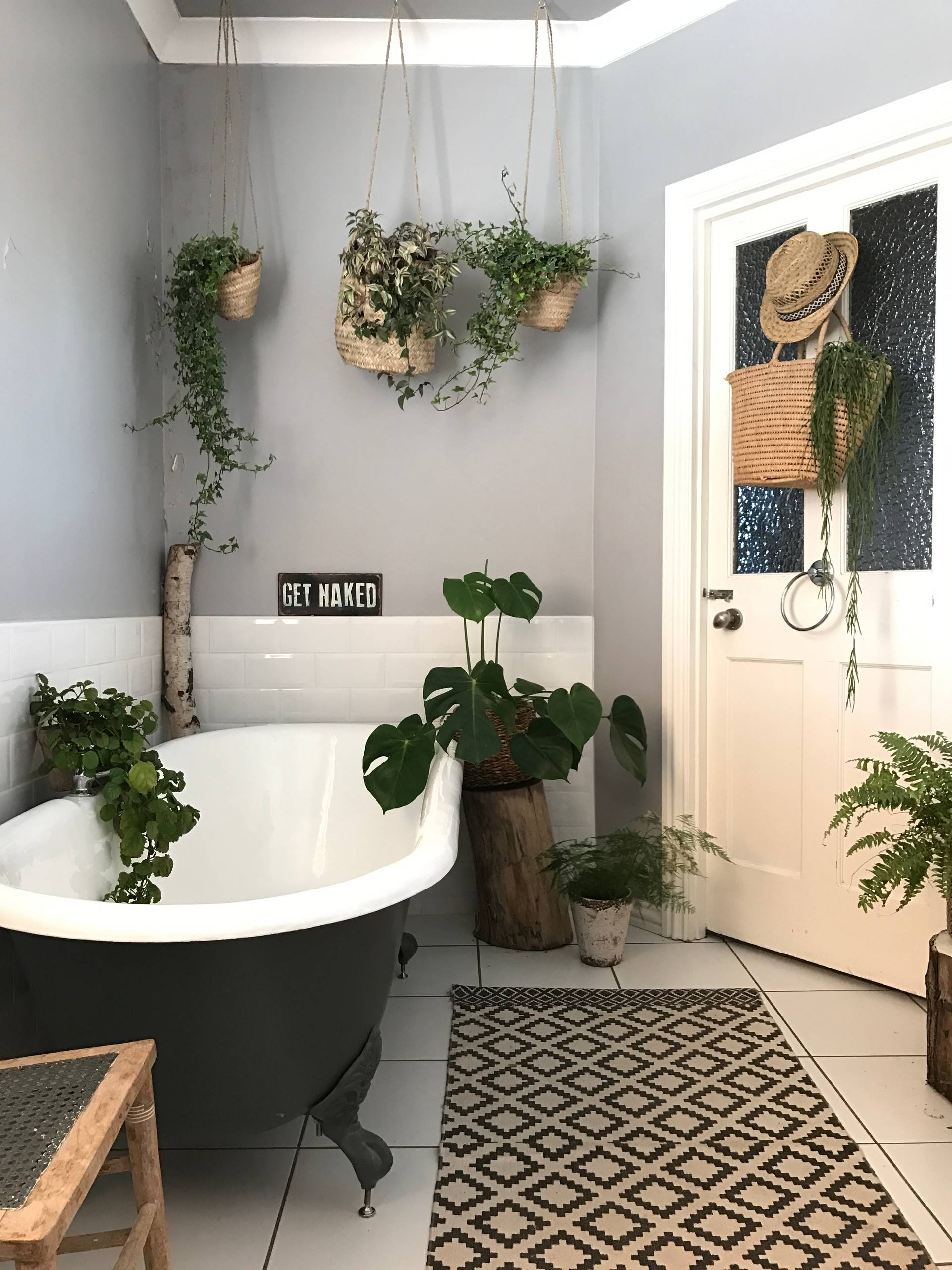 To boost the greenhouse vibe, add as many plants as you can comfortably fit in. If you have a separate shower and only use the bath once in a while, why not use the edges of your tub as another spot from which to let a plant trail?