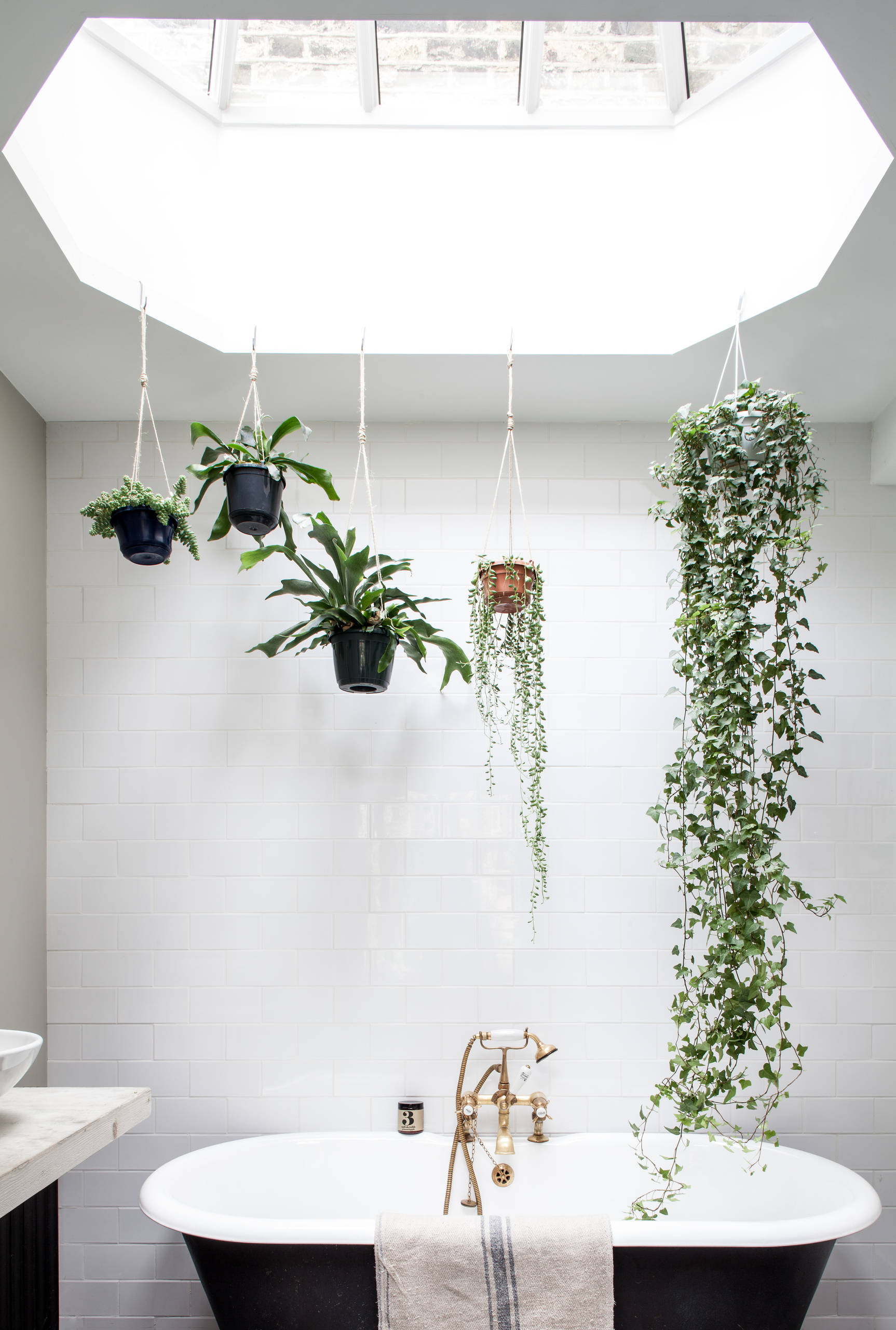 Not many of us will have a ready-made ledge and light source above our baths, but this example shows how wonderful plants can look dangling over a tub, bathed in sunshine.