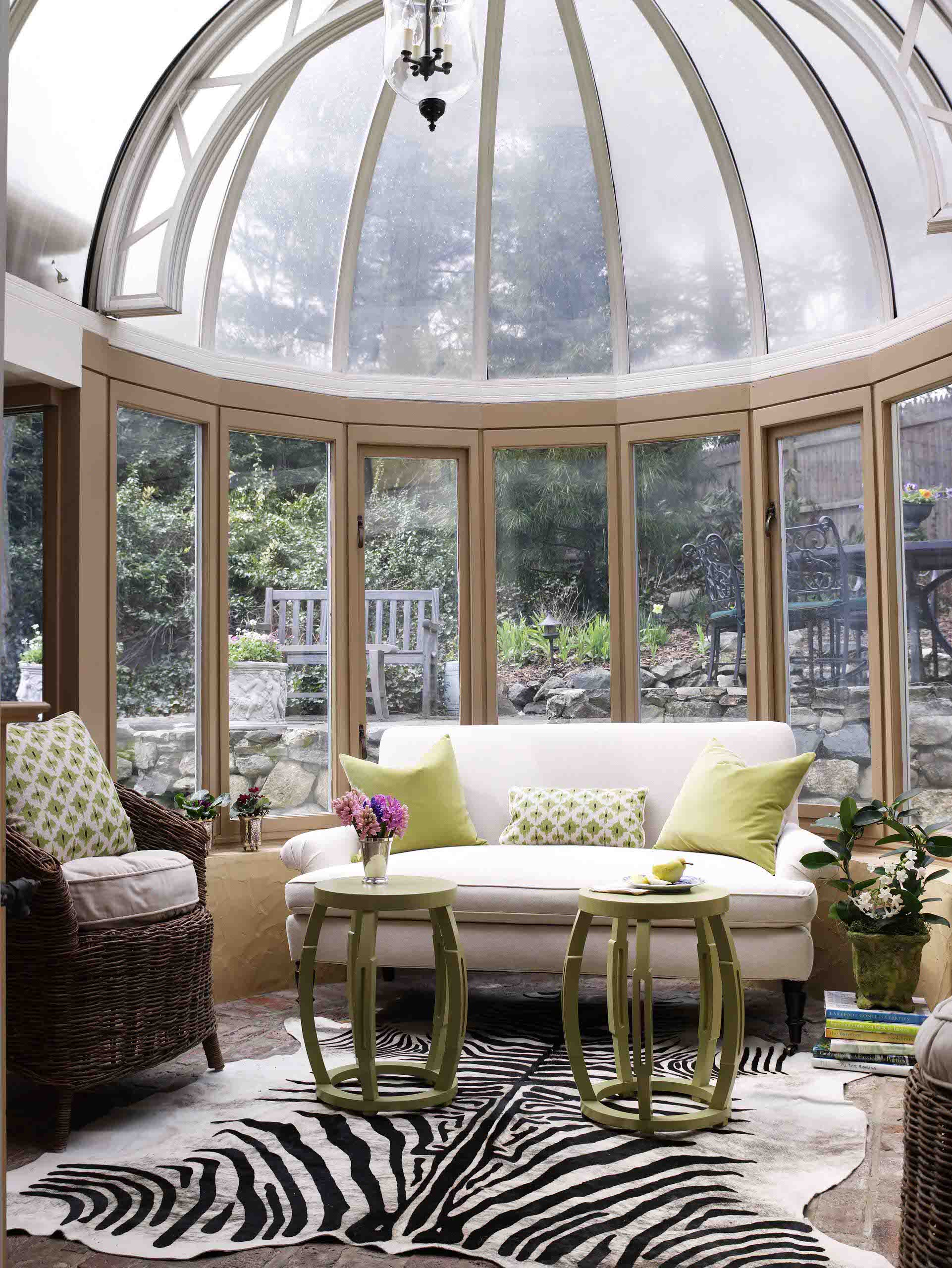 This domed greenhouse has taken external living spaces to a new level. A striking but cosy rug, tables and elegant cushioned seating provide just enough room for Champagne with a few girlfriends on a cool afternoon.