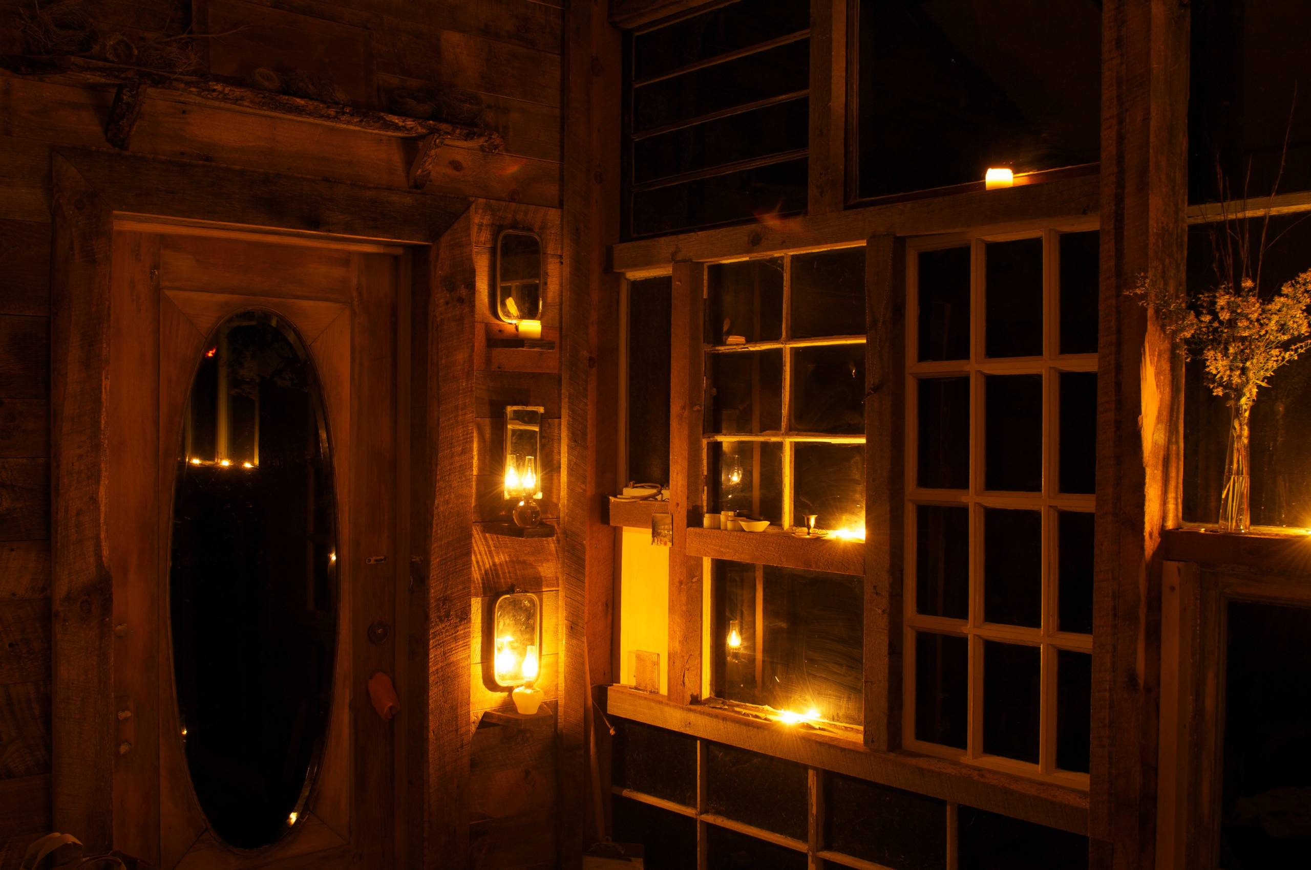 This modern take on a greenhouse had a fireplace installed so the space stays toasty no matter how cold and wet it gets outside. It’s actually a potting shed on one side and a living room on the other (shown next).
