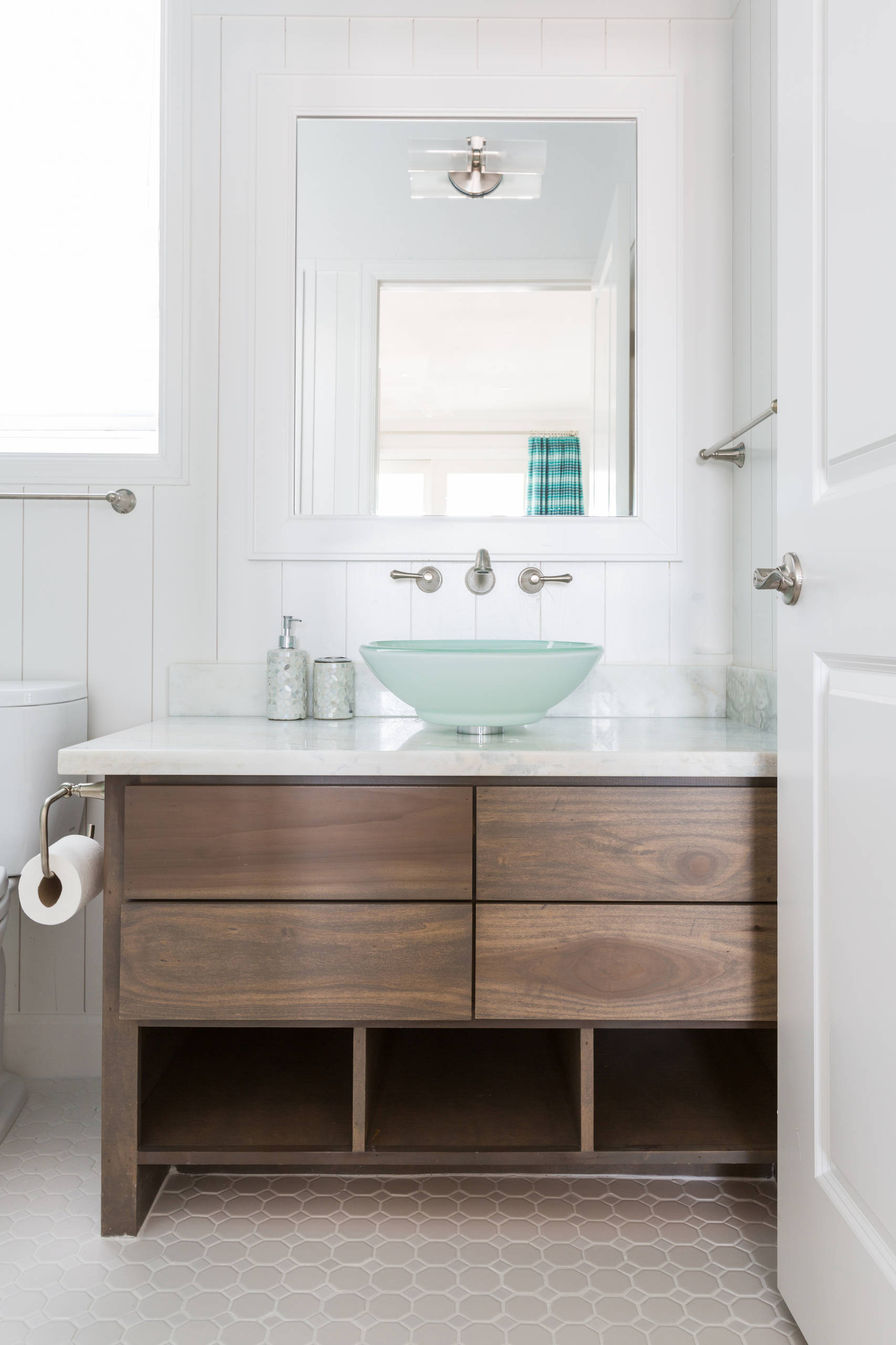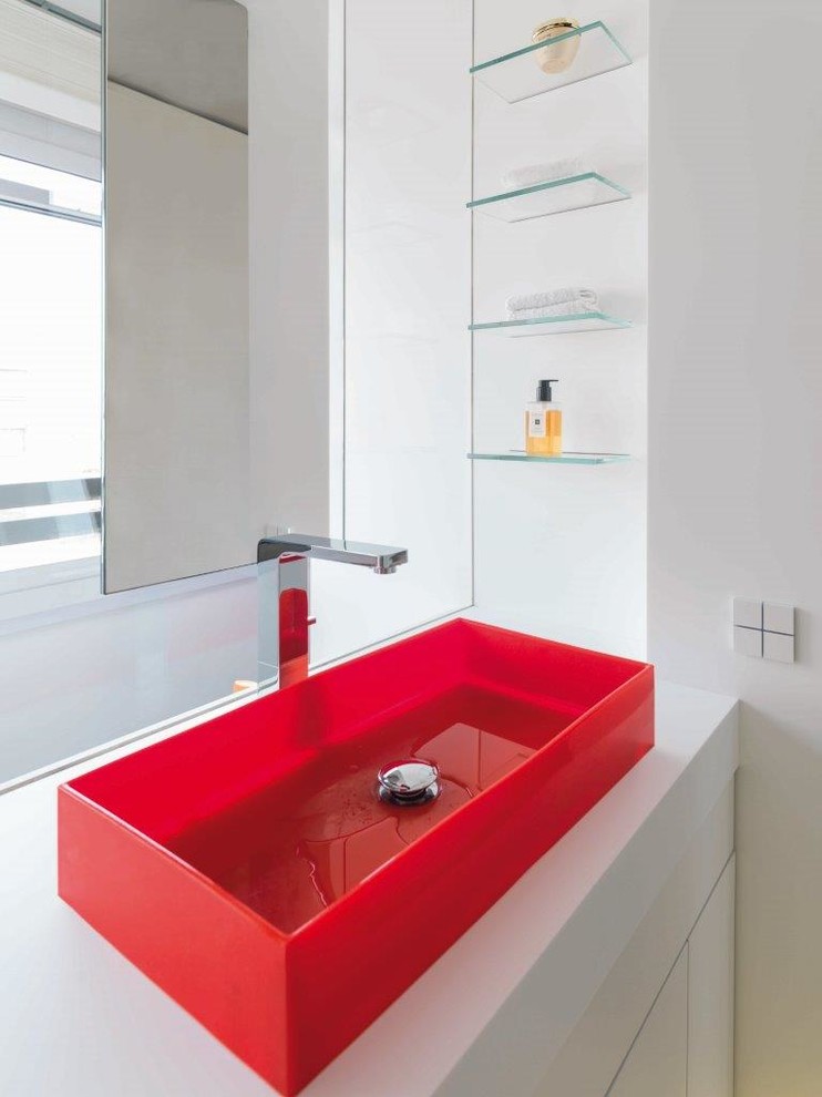 This bathroom shows how it’s done. Here, a bold red rectangular basin makes a dramatic statement in this white bathroom and infuses it with a hearty dose of visual interest.