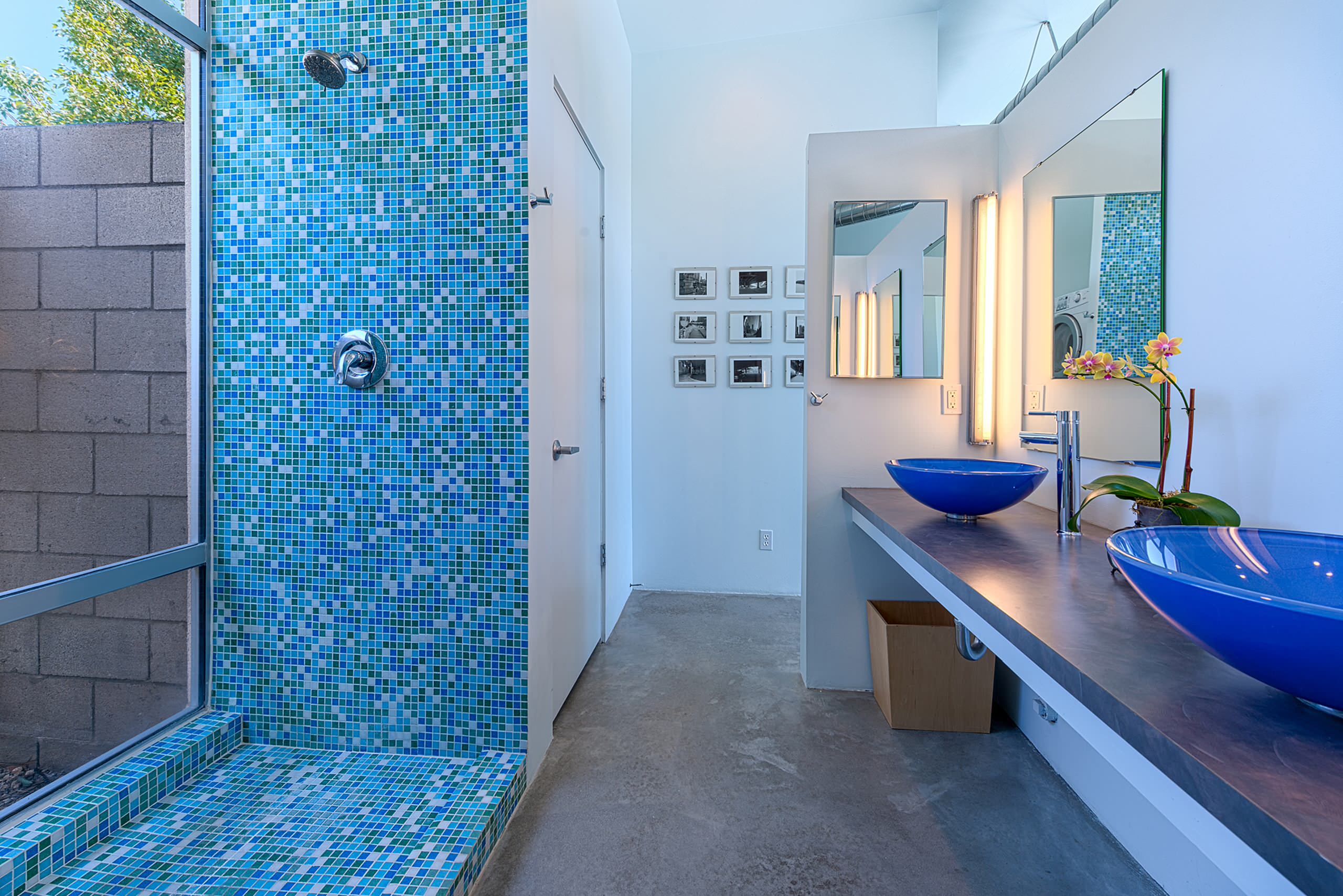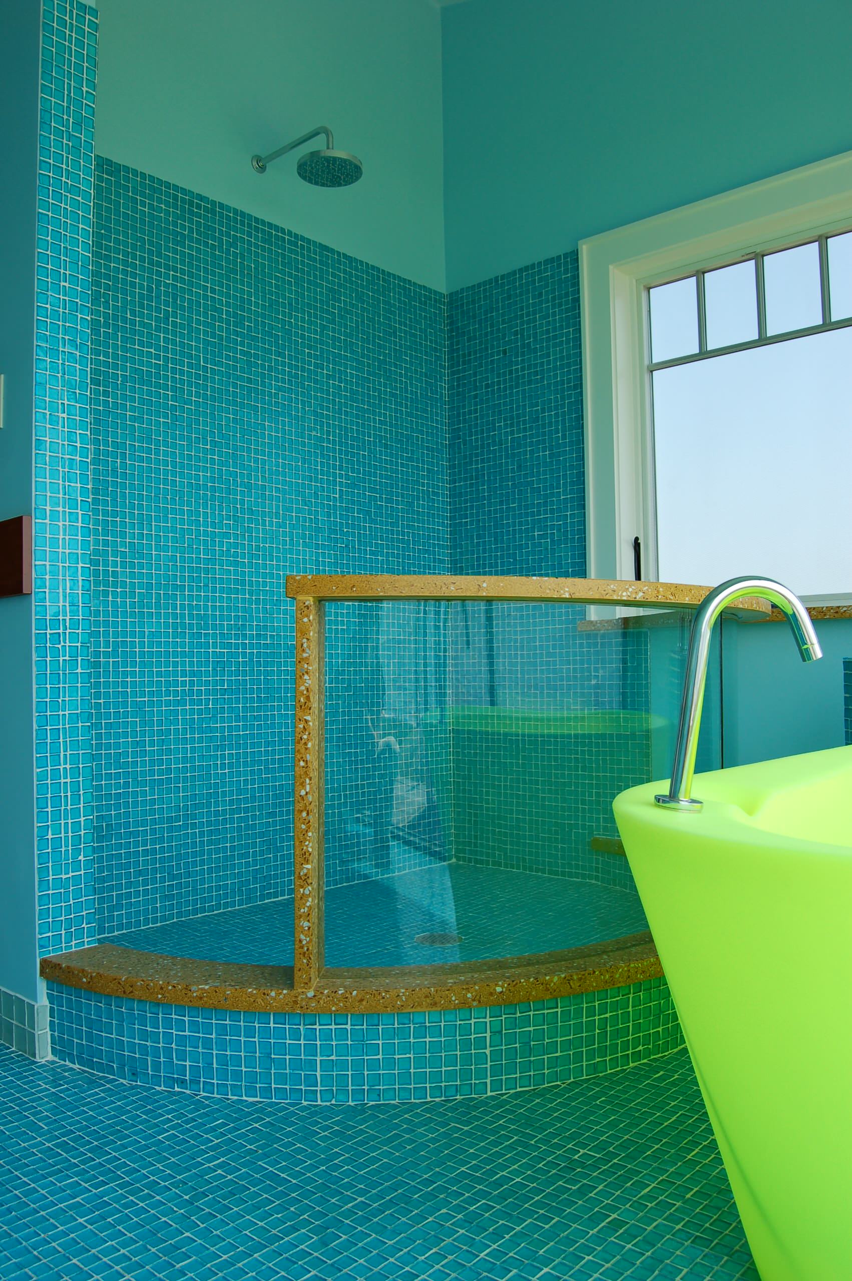 While bright bath fixtures work a treat in all-white and neutral spaces, they can also help ramp up the visual drama in bathrooms that are already awash with colour. Take this contemporary bath zone, for example; it features wall-to-wall turquoise mosaic tiles (and turquoise-painted walls above that), along with a high-energy and high-contrast lime green bathtub, which has been introduced to cut through the blue-green palette, create visual drama and make the scheme sing.