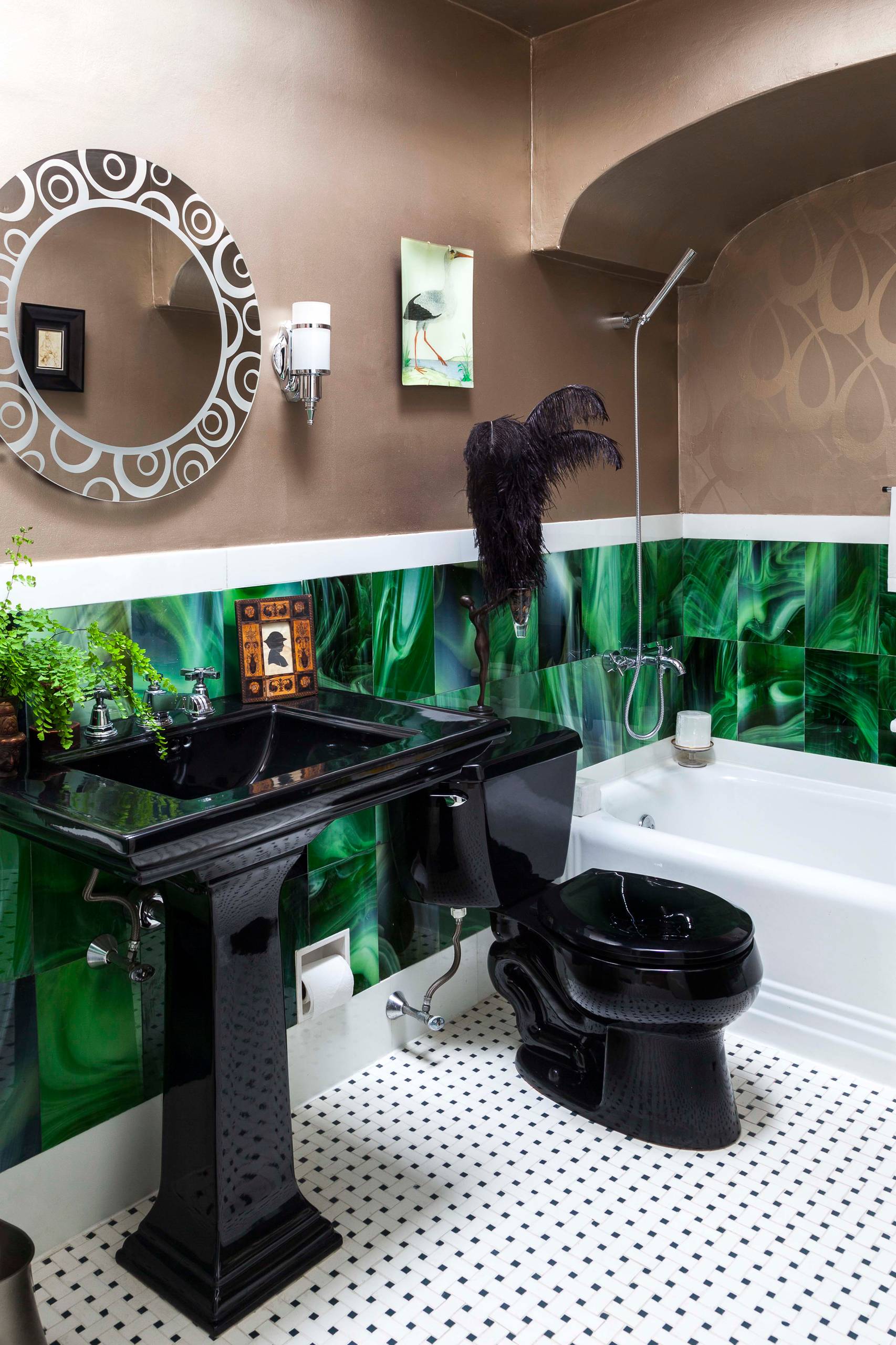 While coloured bath fixtures do offer head-turning appeal, they can also blend into the background and let other design features have their moment in the spotlight, as this striking bathroom proves. Here, a chic black pedestal sink and toilet complement and emphasise the stunning green marble-like tiles that line the walls, rather than command all of the attention. Notice how the emerald green pops against the black bathware, which also echo the dark, almost midnight slicks of green that run through some of the tiles and ensure the fixtures don’t look out of place or too heavy for the scheme.