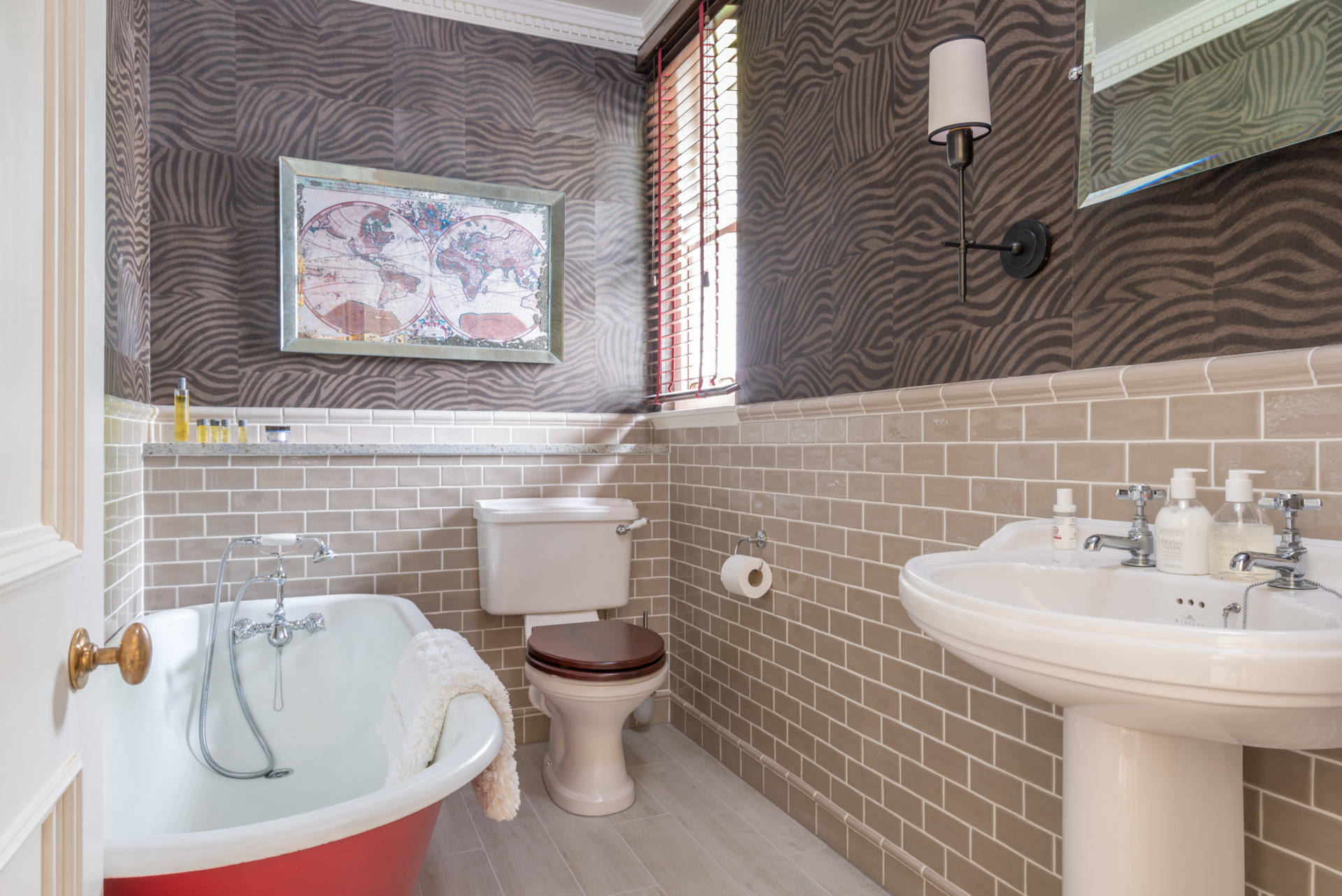 Colourful bathroom fixtures are masters of disguise and can help distract the eye from the shortcomings of your bathroom. This quirky, traditional-style bath area shows how it’s done. Here, an attention-grabbing red claw foot tub works in tandem with the zebra-print wallpaper to distract guests from the diminutive dimensions of the room, as they command attention and don’t let the eyes wander. Take note of how the white basin and toilet offer balance and help lighten the scheme, and ensure it doesn’t look too busy or cramped.