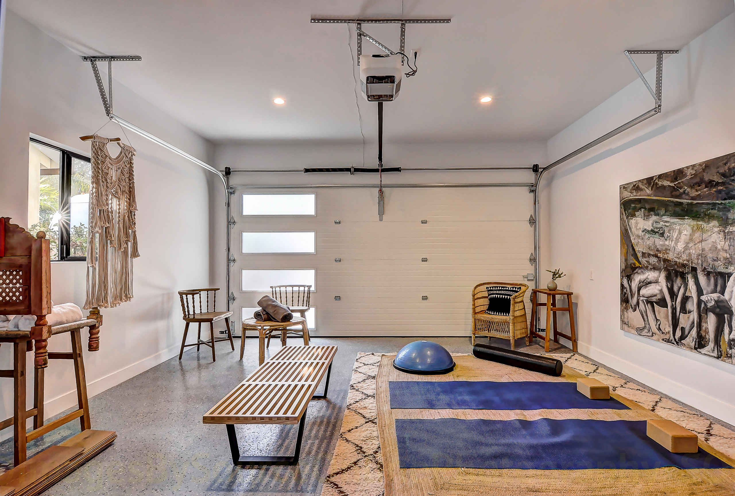 Having a soft throw close at hand is a nice touch, especially in winter, when your room may be on the cool side. A bench (or exercise equipment that can double as one) also makes a nice spot for resting and recovering at the end of a workout.