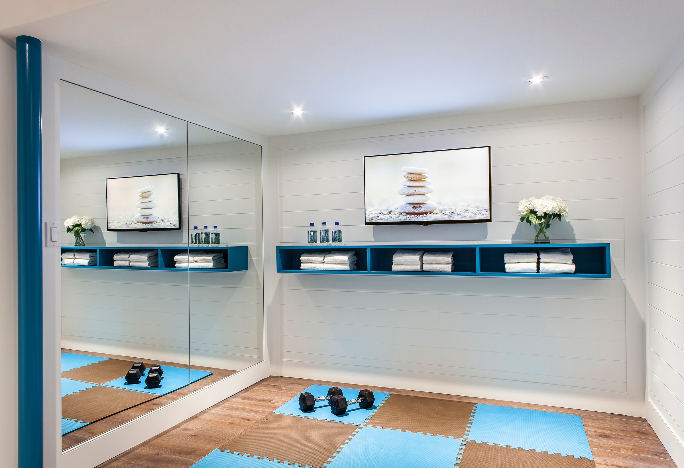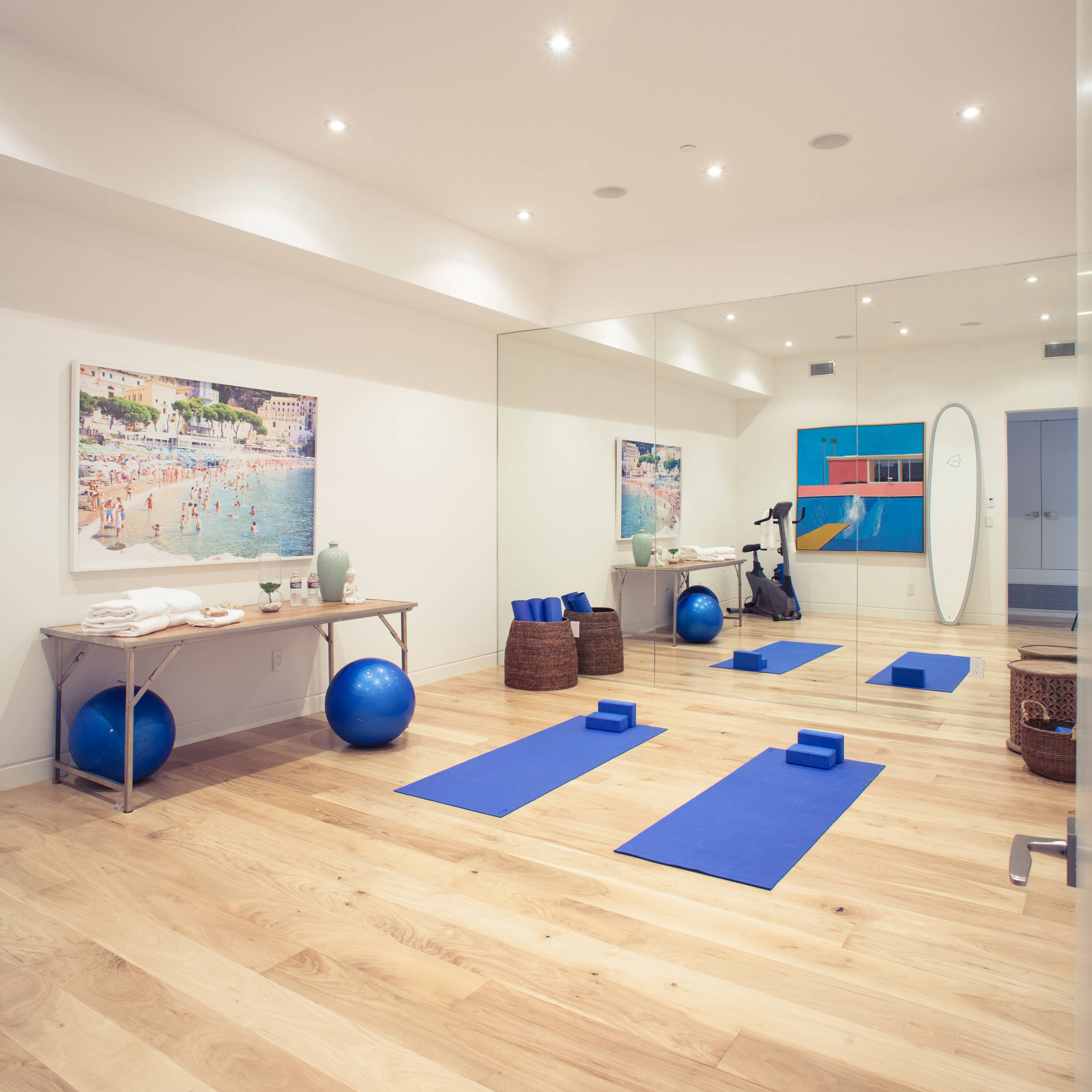 Personalise your workout area with art that speaks to you. An oversize photograph (such as the one shown here) makes a stunning focal point in a home gym; the bigger the better! For a budget option, have one of your own holiday photos blown up to poster size and pop it in a frame.