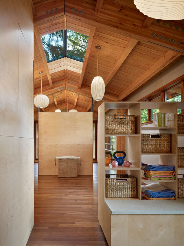 If you are using a section of a larger room as your home gym, a backless bookcase such as the one shown here can do double duty as storage and a space divider.