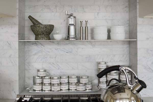 No handyperson skills are required for this easy option. The only guidelines are to find attractive storage containers, label them clearly, then stack them on a nice (preferably fire-resistant, if next to the stovetop) tray. Your herbs and spices will be easy to find, and they’ll look pretty terrific, too.