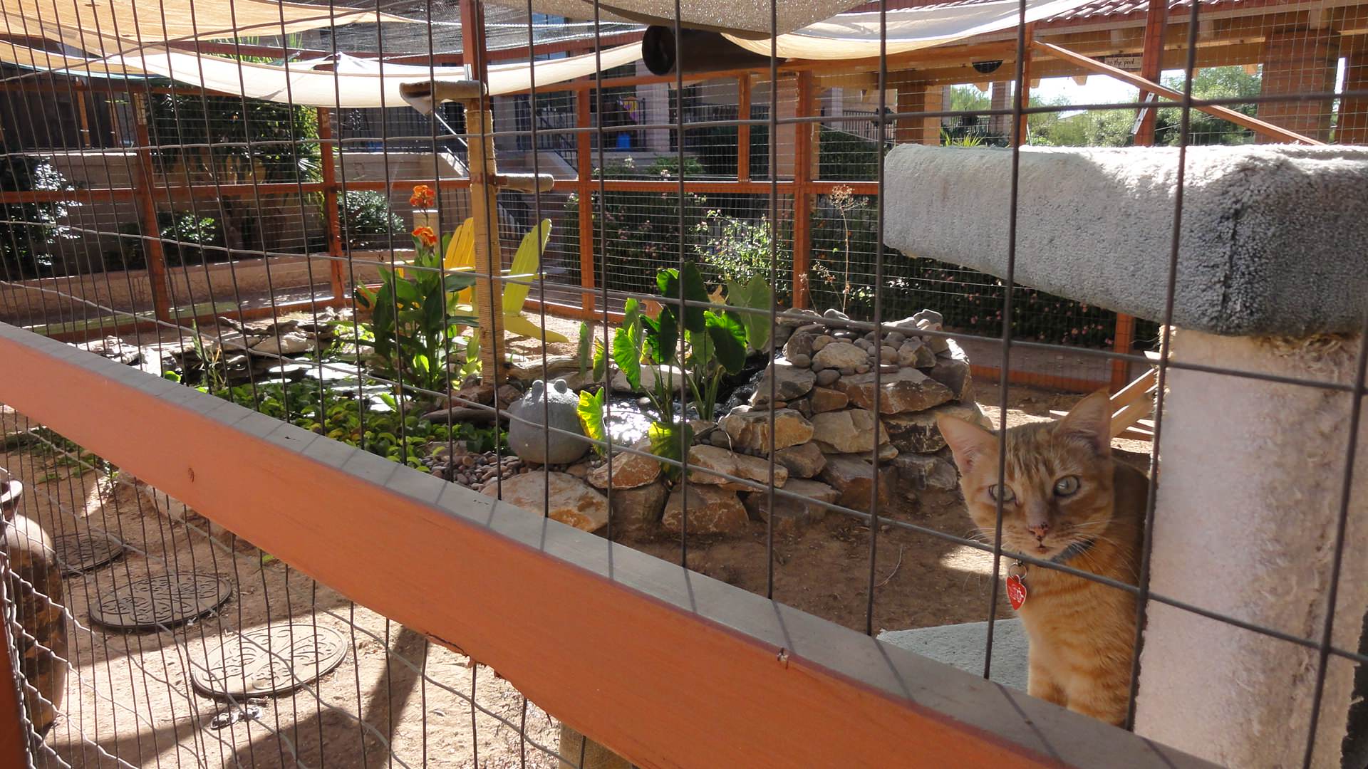 Even if you have outdoor space available, you may need to keep cats indoors to protect them from predators. Or you may choose to keep them in to protect the bird population. In either case, one great way to safely expand your furry friend’s territory is by constructing a protected outdoor patio, or ‘catio’. The one shown here was built by a couple with 16 rescue cats that needed more space than their home could provide. It includes ramps, steps, shade sails, cat-safe plants and a koi pond.