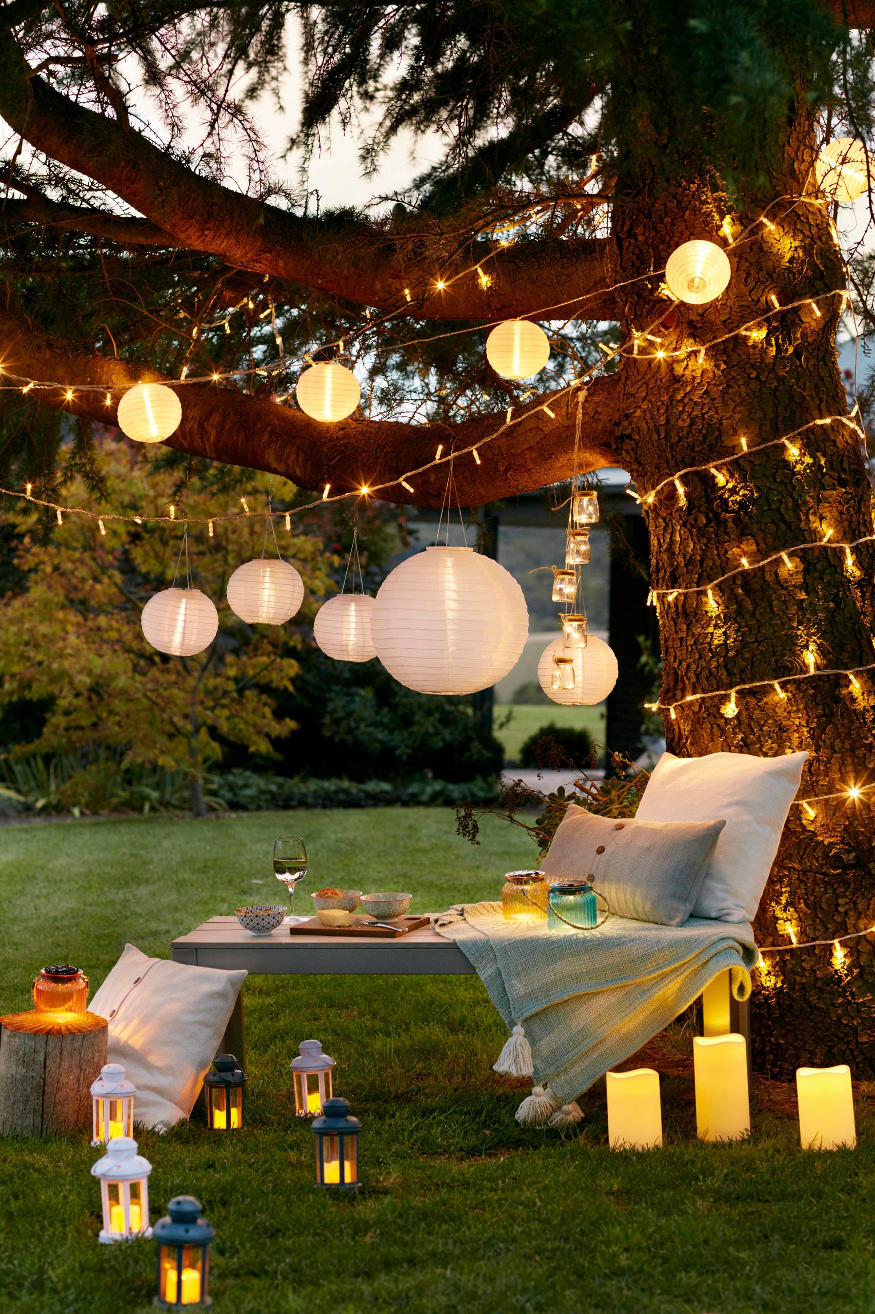 Outdoor lights twinkling over a landscape like tiny stars are just about as magical as it gets. To mimic stars overhead, wrap branches that overhang walkways or your garden to create a softly lit canopy.