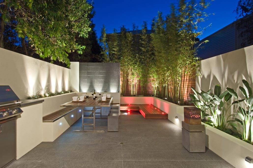 Casting light via wall-mounted spotlights can sometimes provide too many shadows when sitting outside. A more exciting way to light up a private courtyard or compact outdoor entertaining space is to cluster lights along lines strung overhead, draped from one side of the area to the other, simulating the random pattern of stars. This is a very cost-effective way to create a sparkling mood outside, just by using standard light globes.