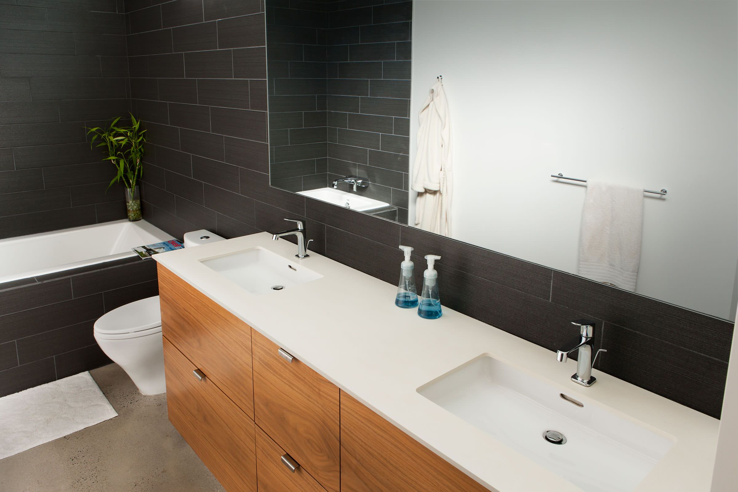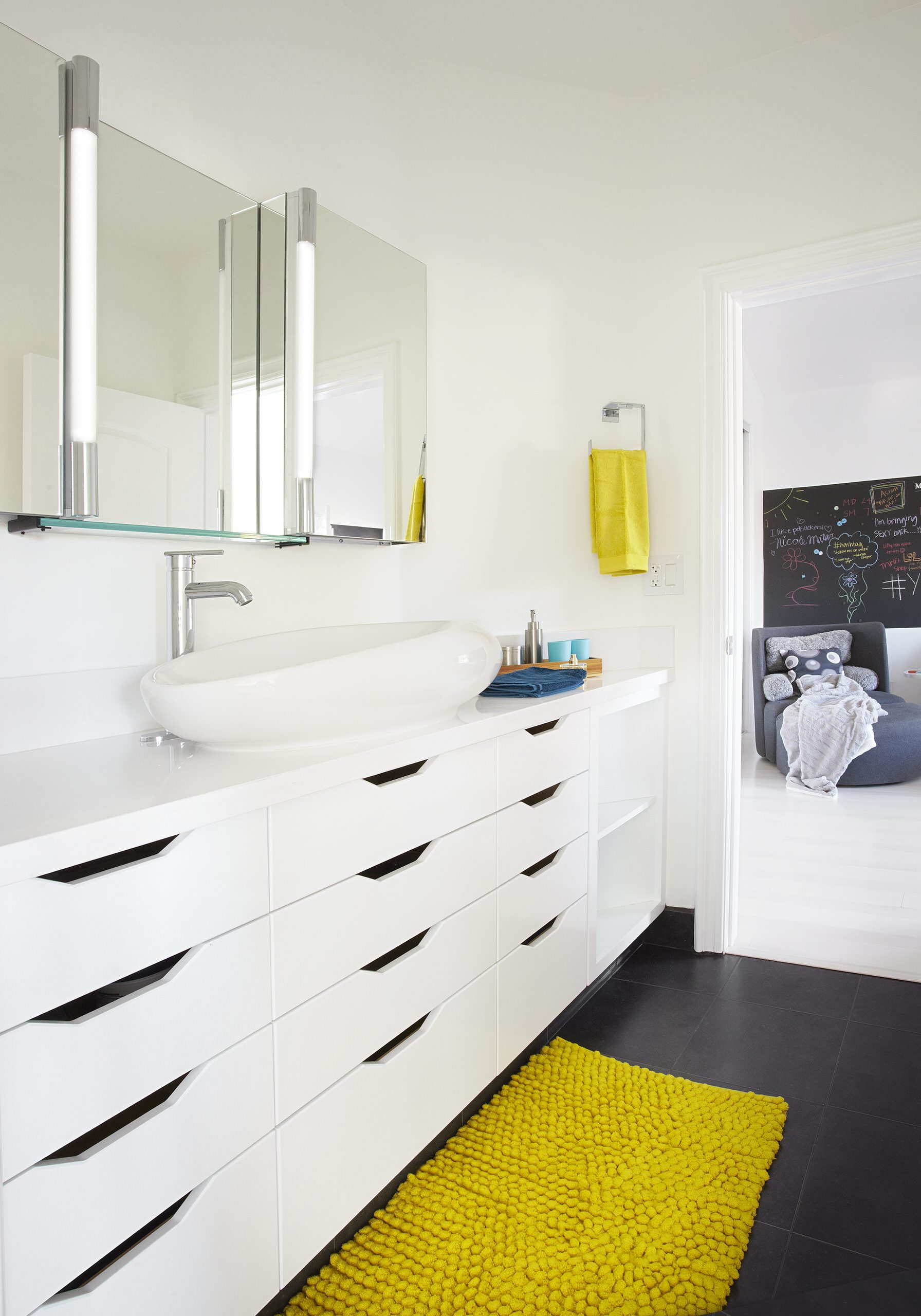 Minimalist design elements not only enhance the look of this modern family bathroom but also improve its functionality. Drawers with cut-out handles are the perfect fit for the room’s clean, streamlined style, and they’re more user friendly than cabinetry with knobs, handles or pulls that may be difficult for some (especially youngsters and elderly family members) to grip.