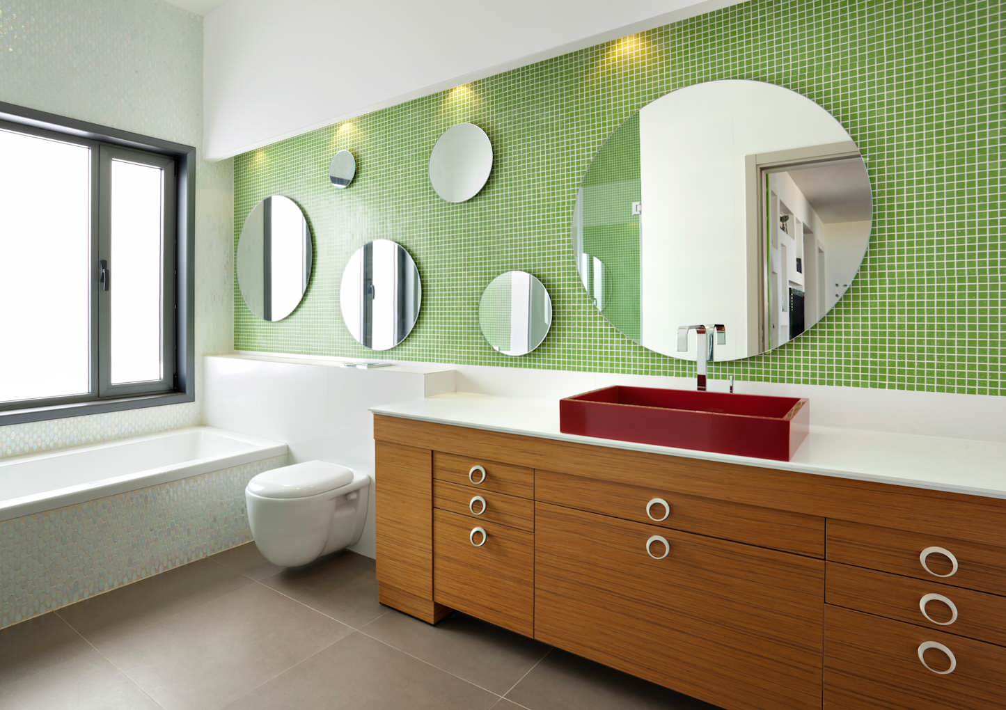 The colour scheme used in this family-friendly bathing area is a happy compromise – a striking tiled feature wall in energetic shades of green takes centre stage, while red accents add drama and flair. Sandy neutrals and timber tones add warmth to the room and tie the look together, resulting in a bathroom that’s fun, fresh and satisfies everyone’s tastes.