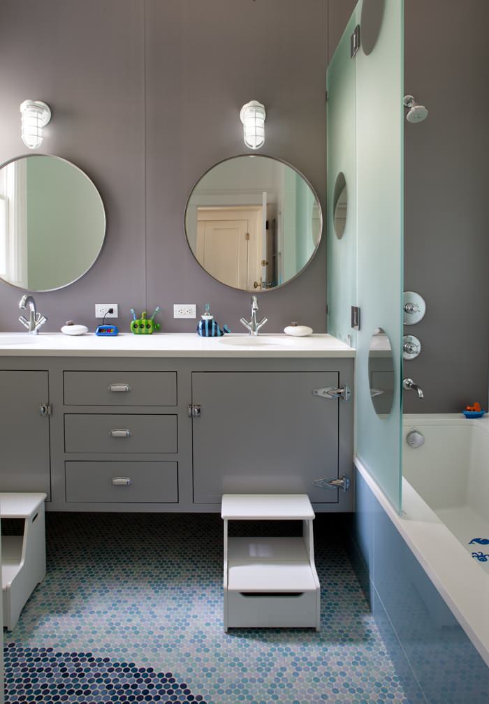A large mirror is essential in any family bathroom – it will make the space appear brighter and larger, and allows multiple people to get ready at once without getting in each other’s way. This cool, contemporary bathing area gets extra points for having not one, but two mirrors. The floor-to-ceiling mirror is just the thing for family members to do a full and final outfit check before running out the door.
