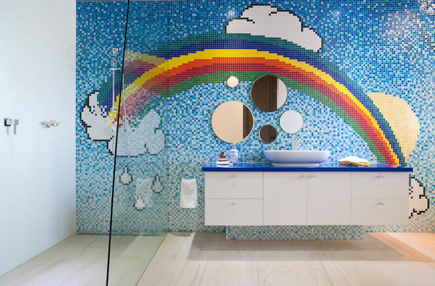 Inject colour and a touch of playfulness into your bathroom by introducing patterned tilework into your scheme. We think this bold and fun cartoon-like tiled feature wall looks pretty stellar, but if you like a more subdued space, choose a simple geometric pattern or chic decorative motif instead.