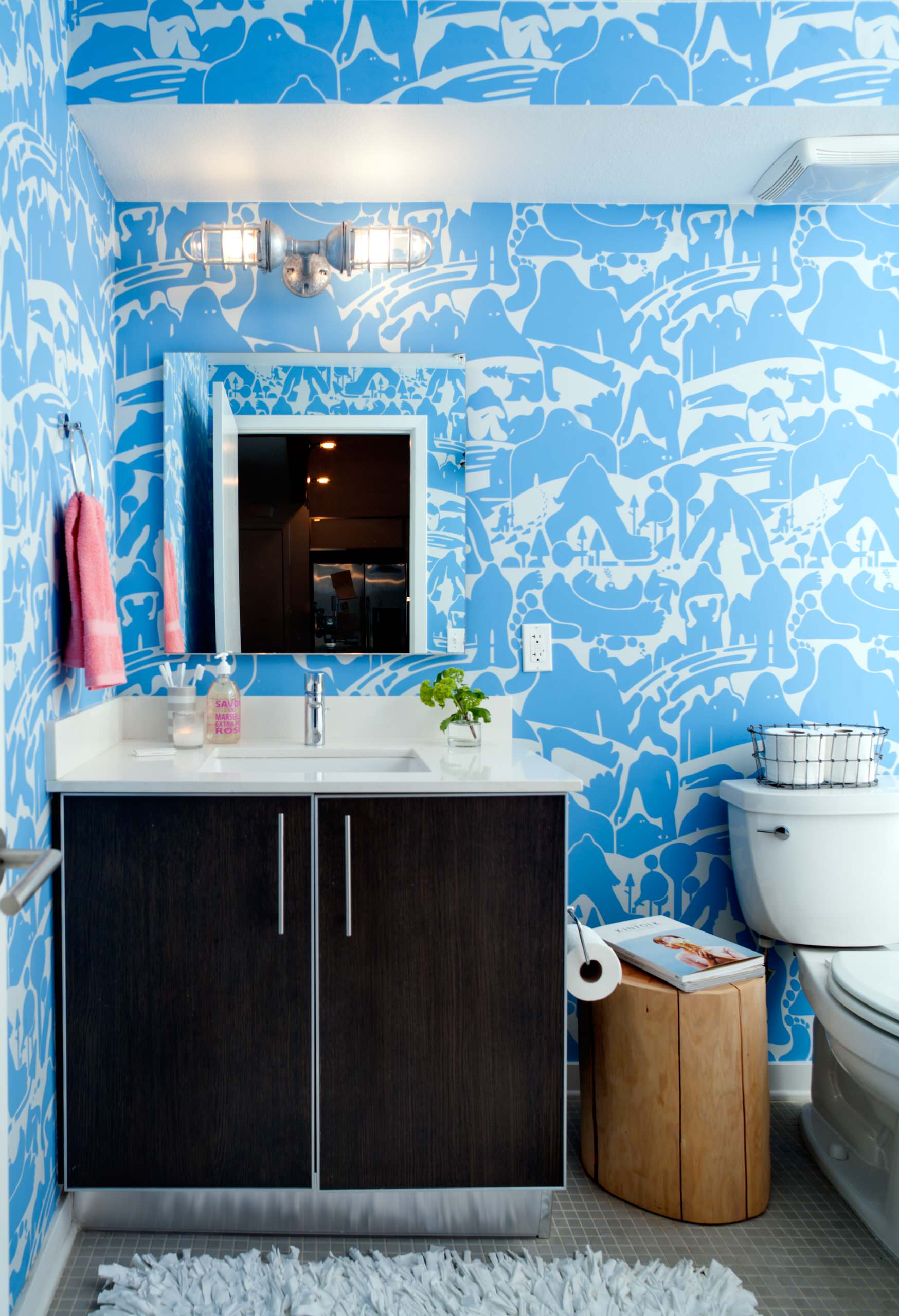 Pops of sky blue and cute bathroom accessories complete the kid-friendly look.