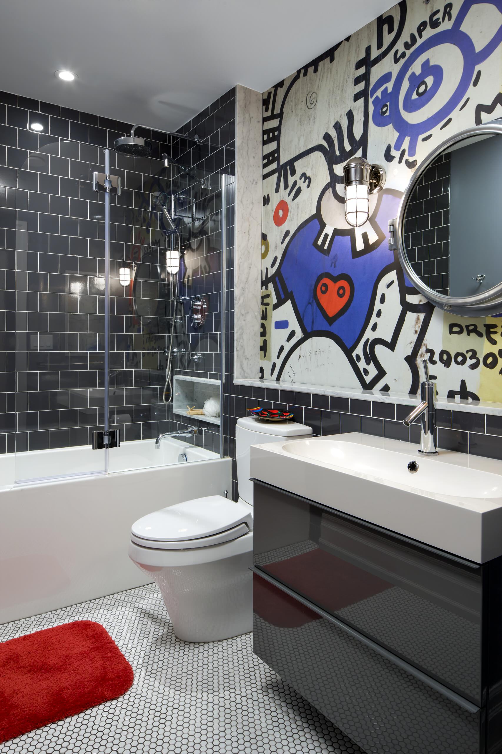 Here, eye-catching graffiti-printed wallpaper adds a hit of bold colour and personality, and in doing so, transforms the space from a sleek, monochrome bathroom into a cool bathing zone that appeals to kids and adults alike. Minimalist bathware and tapware, white penny floor tiles and industrial-style accents add a touch of grown-up sophistication and balance the playful style of the graphic wall covering.