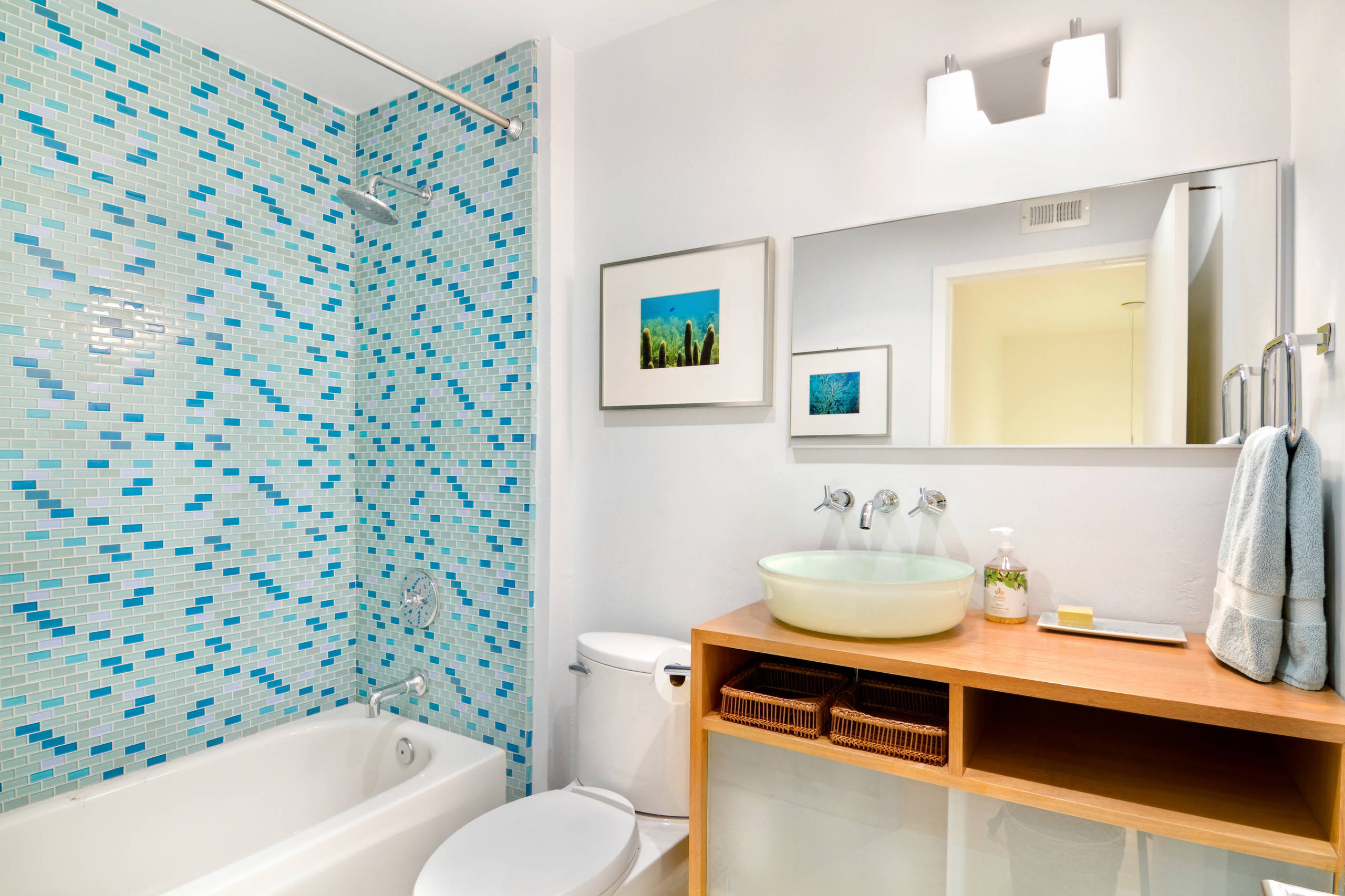 Soft, blue mosaic tiles complete the look and add a splash of colour.