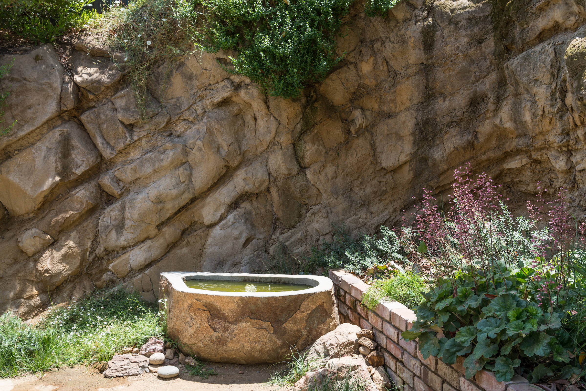 Scott’s design uses the steep slope as a backdrop to show off the plants as well as other garden features, such as a fountain made from a hollowed stone planter and built-in bench seating. “The face of the rocks that had formerly been one of the owner’s biggest complaints about the yard, became a huge accent for lighting,” says Scott. “They are magical at night when up-lit.”