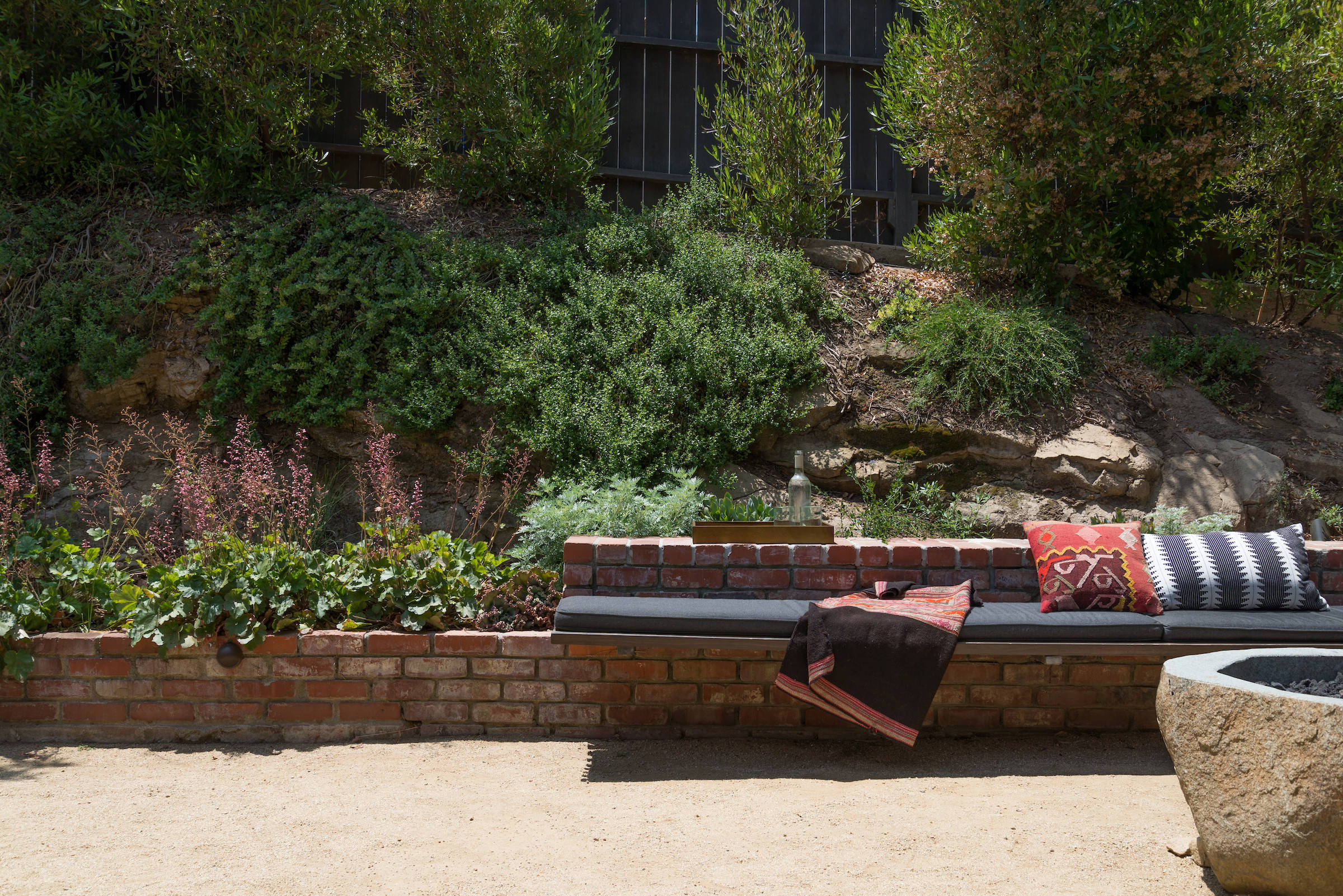 Other areas of the backyard include a curved seating area anchored around an outdoor fire pit and an area for outdoor dining, tucked out of sight to the right.