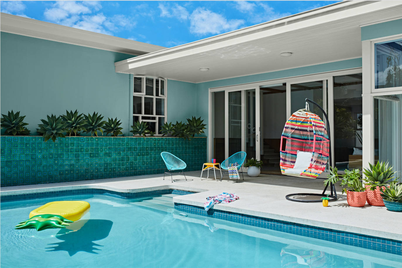 A powder-soft blue paired with pink accents evokes a laid-black old Hollywood-style glamour. This pastel palette is styled to flatter all homes built in mid-century style; however, it translates equally well to coastal and modern architecture.