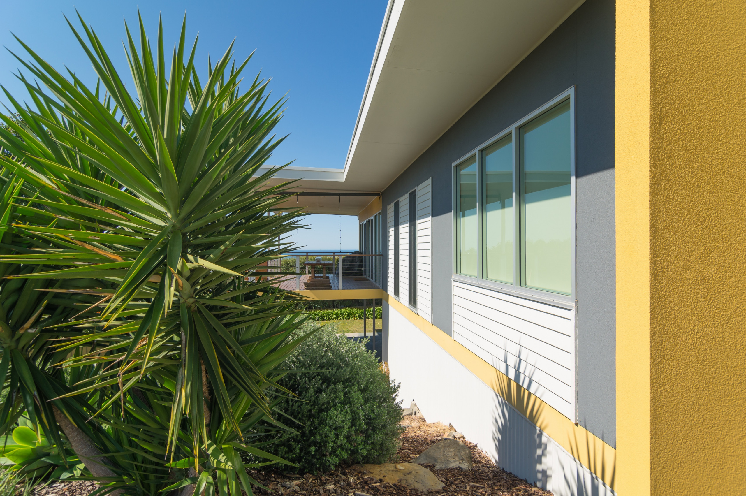 This South Australian beachside home channels ’50s charm with its colour-blocked use of slate-blue and yellow. Duplicate this look using two colour-blocked bolds at equal strength, anchored together with a contrasting neutral.