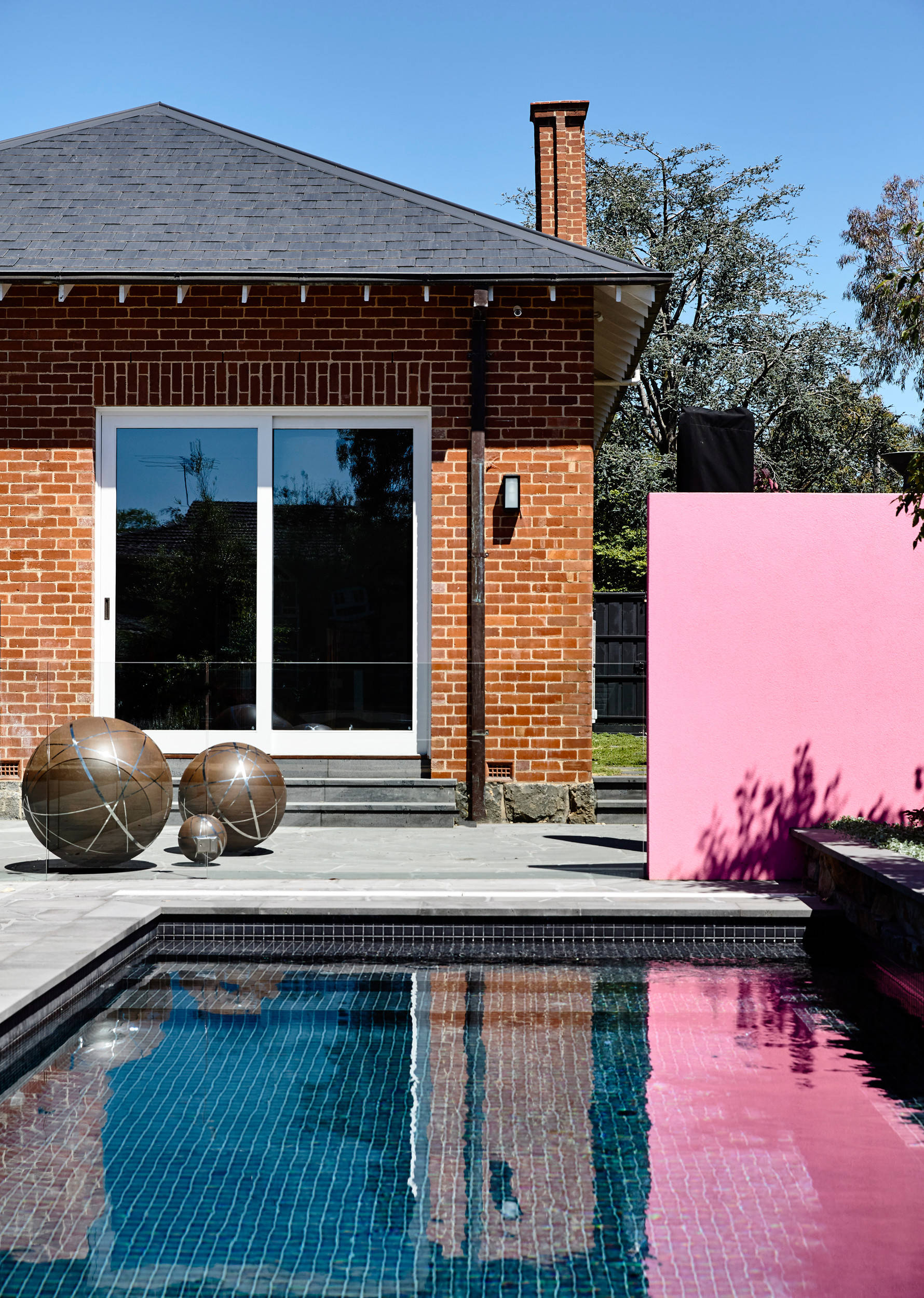 To add a dose of contemporary glamour to a brick home, choose black or almost-black for the trims: it will play up the red and gold hues of the bricks. Black is also a wonderful partner to the honeyed hues of natural stone and timber.