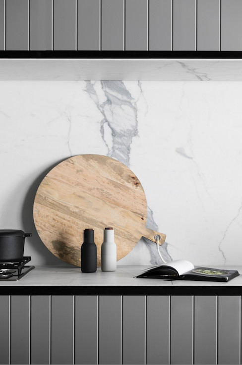 “The Contribute palette is all about tactility, bringing together tonal variations through colour and materials,” she says. “Greys are warmed with browns found in wooden flooring and accessories. Fluidity and texture is added through stone, travertine, marble and metallics, and a mix of gloss and matt finishes.